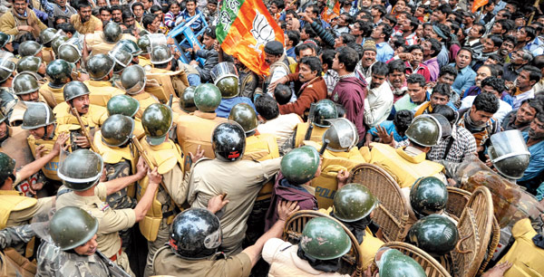বস্তুত, কর্মসূচি সফল করতে নদিয়া থেকে এ দিন বেলা পৌনে ৩টে নাগাদ সিউড়িতে পৌঁছে যান বিজয়বর্গীয়রা। সিউড়ি সার্কিট হাউসের কাছে একটি বড় মিছিল করে তাঁরা প্রশাসনিক ভবন সংলগ্ন সভামঞ্চে জড়ো হন। শীর্ষ নেতৃত্বের উপস্থিতিতে প্রথমে শুরু হয় সভা। বিজয়বর্গীরা নিজেদের বক্তব্যে তীব্র আক্রমণ করেন তৃণমূল সরকারকে। সেখানে বাংলাদেশি অনুপ্রবেশ থেকে সারদা-কাণ্ড, নারী নির্যাতন, রাজ্যের আইনশৃঙ্খলা পরিস্থিতির অবনতি, শিল্প বন্ধ হয়ে যাওয়া, বিরোধীদের কণ্ঠরোধ— ছিল সমস্ত প্রসঙ্গই। সভায় বক্তব্য রাখার পরে বিজয়বর্গীয়র নেতৃত্বে বিশাল মিছিল জেলা প্রশাসনিক কর্যালয়ে ঢুকতে গেলে পুলিশের সঙ্গে প্রবল ধস্তাধস্তি শুরু হয়। ব্যারিকেড ভেঙে নেতৃত্ব-সহ কয়েক জন প্রশাসনিক ভবনের চত্বরে ঢুকেও পড়েন। তবে, বাকিদের আটকে দিতে সফল হয় চূড়ান্ত সতর্ক পুলিশ।
