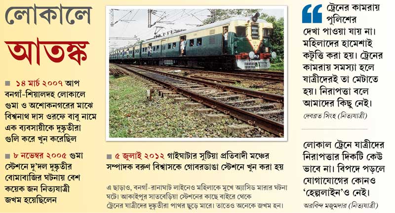 বনগাঁ-রানাঘাট লোকাল ট্রেনেও একই অবস্থা। নিরাপত্তা কিছুই থাকে না। বেশি রাতে ওই ট্রেনে করে যাতায়াত করতে মানুষ ভয় পান। স্থানীয় আকাইপুর স্টেশনের কাছে ট্রেনের যাত্রীদের লক্ষ্য করে ইট-পাথর ছোড়ার ঘটনাও ঘটেছে। রাতে এ দিকের কয়েকটি স্টেশন দুষ্কৃতীদের নিরাপদ আস্তানায় পরিণত হয় বলে অভিযোগ। বনগাঁ জিআরপি সূত্রের খবর, বিশেষ কয়েকটি স্টেশনে রাতে ‘নাইট পিকেট’ থাকে। তবে তা সব স্টেশনে দেওয়া সম্ভব হয় না।