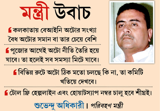 বাম অথবা তৃণমূল, দুই জমানাতেই অটো রুটগুলিকে নিয়ন্ত্রণ করে শাসক দলের শ্রমিক সংগঠন। প্রশাসনের পক্ষে অটোকে নিয়ন্ত্রণ করা কার্যত অসম্ভব বলে পুলিশ ও পরিবহণ-কর্তাদের অনেকেরই অভিমত। শুভেন্দু অবশ্য অতীতে কী হয়েছে তা নিয়ে ভাবতে চান না। তিনি এ দিন জোর গলায় জানিয়েছেন, ‘‘পুজোর আগেই ‘অটো নীতি’ তৈরি করা হবে। তার পরেই সমস্যা মিটে যাবে।’’