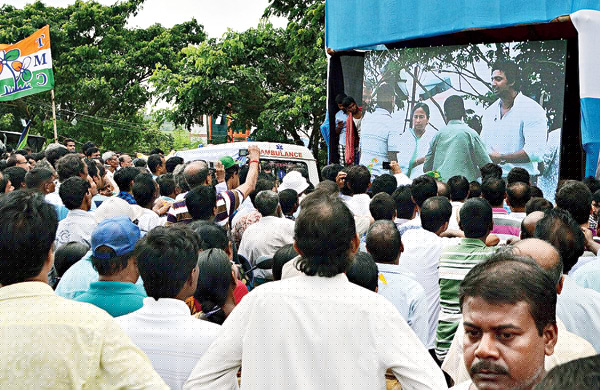 উপচে পড়া ভিড় সভাস্থলে। বাইরের জায়ান্ট স্ক্রিনে নজর দর্শকদের।