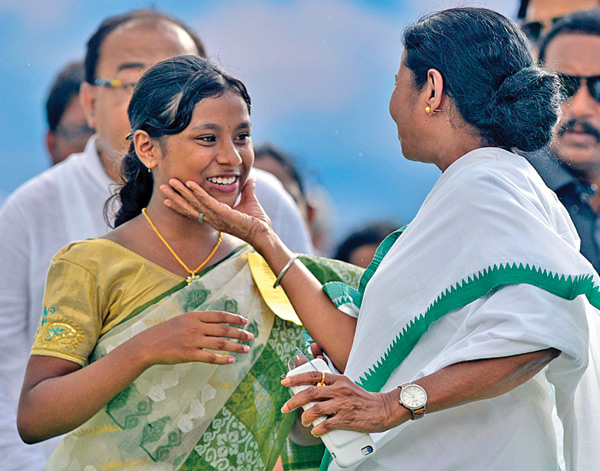 সিঙ্গুর আন্দোলনের সময়ে মায়ের সঙ্গে গ্রেফতার হয়েছিল ছোট্ট পায়েল বাগ। এ দিন মঞ্চে মুখ্যমন্ত্রীর সঙ্গে পায়েল। বুধবার।