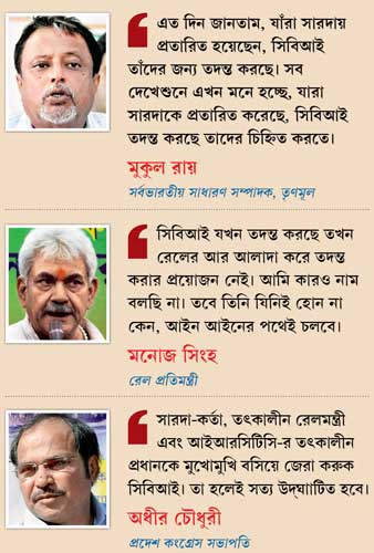 তবে মমতার দলের সর্বভারতীয় সাধারণ সম্পাদক ও প্রাক্তন রেলমন্ত্রী মুকুল রায় বলেন, “এত দিন জানতাম, যাঁরা সারদায় প্রতারিত হয়েছেন, সিবিআই তাঁদের জন্য তদন্ত করছে। সব দেখেশুনে এখন মনে হচ্ছে, যারা সারদাকে প্রতারিত করেছে, সিবিআই তদন্ত করছে তাদের চিহ্নিত করতে।” তাঁর এই মন্তব্যের কোনও ব্যাখ্যা মুকুলবাবু দেননি। তবে তৃণমূল সূত্রে বলা হচ্ছে, সুদীপ্ত সেন প্রতারণা করেননি, বরং প্রতারিত হয়েছেন, জনমানসে এমন একটা ধারণা তৈরি করার চেষ্টা চলেছে। মুকুলবাবু তার বিরুদ্ধেই মুখ খুলেছেন। তবে সিবিআই সূত্রে বলা হচ্ছে, সুদীপ্তকে প্রতারণা করতে কারা সাহায্য করেছেন, সেটা খুঁজে বার করাও তাদের কাজ। সুপ্রিম কোর্টও সারদা কেলেঙ্কারিতে যুক্ত প্রভাবশালীদের খুঁজে বের করতেই বলেছে।