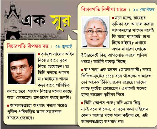 এবং আদালতের পর্যবেক্ষণ, “রাজ্য সরকার আসলে ঠিকই করে ফেলেছে যে, এটা আদালতগ্রাহ্য অপরাধ নয়।” জবাবে সরকারপক্ষের সওয়াল, “আমরা বলছি না যে, কোনও অপরাধ নয়। শুধু বলছি, আদালতগ্রাহ্য অপরাধ নয়।” শুনে বিচারপতি মাত্রের মন্তব্য, “উনি (তাপস পাল) এমন কিছু না-ই বলে থাকলে ক্ষমা চাইলেন কেন? উনি নিজে জানেন, কী বলেছেন! এখন আপনি বলছেন, আদালতগ্রাহ্য অপরাধ নয়!”