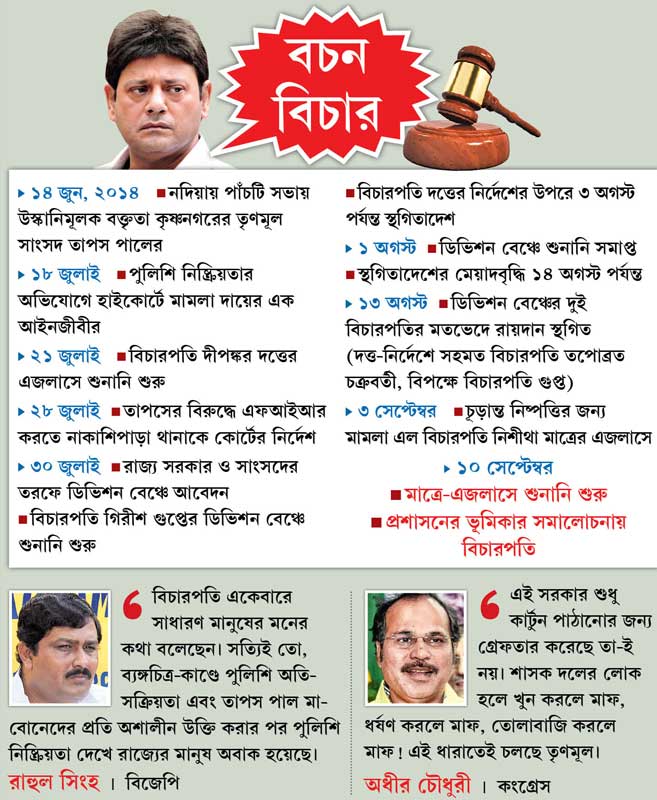 কৃষ্ণনগরের তৃণমূল সাংসদ তাপসবাবুর বিরুদ্ধে অভিযোগ: গত জুন মাসে নদিয়ার পাঁচ জায়গায় প্রকাশ্য সভায় তিনি প্ররোচনা ও বিদ্বেষমূলক নানা মন্তব্য করেছেন। এ জন্য সাংসদের বিরুদ্ধে আইনি ব্যবস্থা গ্রহণের প্রশ্নে এ দিন হাইকোর্টে চূড়ান্ত শুনানি শুরু হয়েছে, বিচারপতি নিশীথা মাত্রের বেঞ্চে। তাপস-মামলায় এর আগে বিচারপতি দীপঙ্কর দত্ত প্রশাসনিক নিষ্ক্রিয়তার সমালোচনা করেছিলেন। এবং এ দিনও নানা প্রসঙ্গে তাপস-কাণ্ডে সরকারি ভূমিকা সম্পর্কে সংশয়ের সুর ঘুরে-ফিরে উঠে এসেছে বিচারপতি মাত্রের মন্তব্যে। ‘‘তাপস পাল শাসকদলের সাংসদ বলেই কি রাজ্য ব্যাপারটা চাপা দিতে চাইছে?” সরকারপক্ষের কাছে জানতে চেয়েছেন তিনি।
