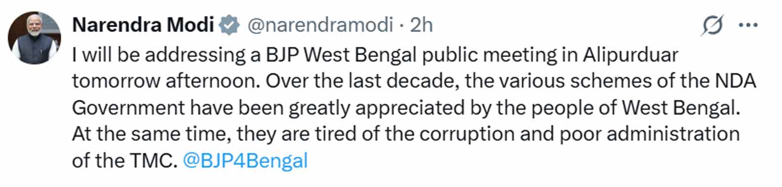 আলিপুরদুয়ারের জনসভার সুর পশ্চিমবঙ্গের মাটি ছোঁয়ার আগের দিনই বেঁধে দিয়েছেন মোদী। বুধবার বিকেলে নিজের ‘এক্স’ হ্যান্ডলে তিনি লিখেছেন, ‘আগামী কাল (বৃহস্পতিবার) বিকালে আমি আলিপুরদুয়ারে পশ্চিমবঙ্গ বিজেপির একটি জনসভায় ভাষণ দেব। গত এক দশক ধরে এনডিএ সরকারের বিভিন্ন প্রকল্প পশ্চিমবঙ্গের মানুষের দ্বারা দারুণ ভাবে প্রশংসিত হয়েছে।’ পরের বাক্যেই মোদী লিখেছেন, ‘তাঁরা (পশ্চিমবঙ্গের মানুষ) তৃণমূলের দুর্নীতি এবং অপশাসনে ক্লান্ত।’
