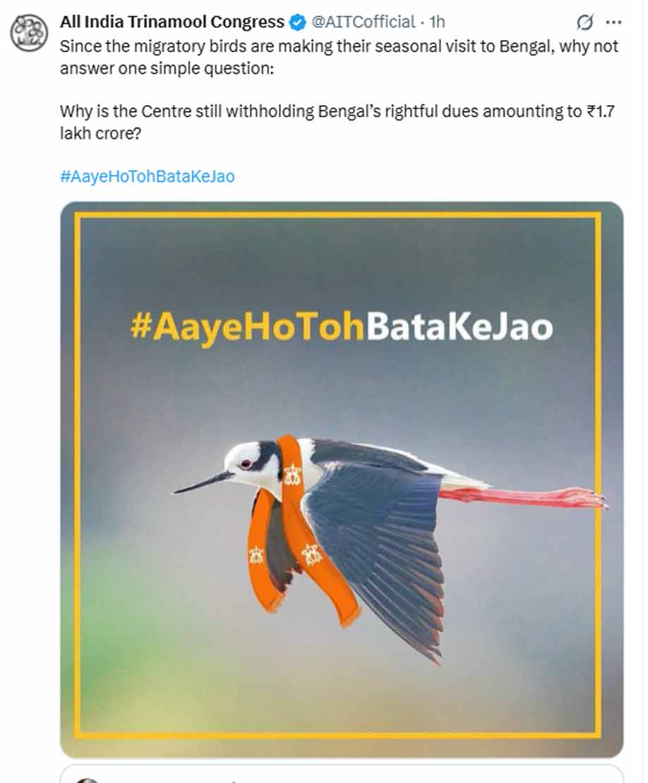কালক্ষেপ না-করে পাল্টা তৃণমূল সেই ‘এক্স’ হ্যান্ডলেই লিখেছে, ‘যেহেতু পরিযায়ী পাখিরা বাংলায় তাদের মরসুমি ভ্রমণ শুরু করছে, তাই কেন এই সহজ প্রশ্নের জবাব দেবে না যে, কেন্দ্রীয় সরকার কেন রাজ্যের ১ লক্ষ ৭০ হাজার কোটি টাকা ন্যায্য পাওনা আটকে রেখেছে?’ ইংরেজি অক্ষরে ‘হ্যাশট্যাগ’ দিয়ে লেখা হয়েছে ‘আয়ে হো তো বতাকে যাও’ (এসেছেন যখন, বলে যান)। যে পাখিটির ছবি তৃণমূলের তরফে পোস্ট করা হয়েছে, তার গলায় একটি গেরুয়া উত্তরীয়। তাতে বিজেপির প্রতীক পদ্মফুল আঁকা।