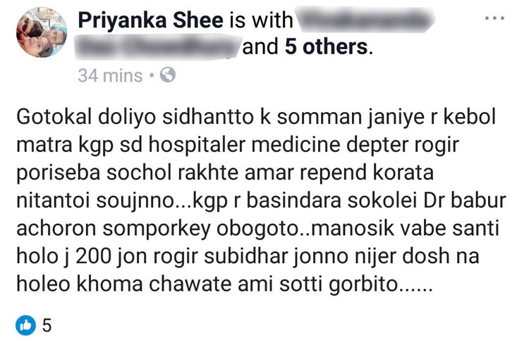 এর কিছু ক্ষণ পরে অবশ্য প্রিয়াঙ্কার ফেসবুক অ্যাকাউন্টে ওই পোস্টটি (যদিও ফেসবুক পোস্টের স্ক্রিনশট আমাদের হাতে রয়েছে) দেখা যায়নি। প্রিয়াঙ্কার অবশ্য দাবি, তিনি পোস্টটি মুছে ফেলেননি। কিন্তু এমন পোস্ট করলেন কেন? প্রিয়াঙ্কার জবাব, ‘‘আমি এমন কোনও মন্তব্য ফেসবুকে করিনি যাতে চিকিৎসক আঘাত পান। বরং ফেসবুকে যা লিখেছি তাতে চিকিৎসকের প্রশংসাই করেছি।’’