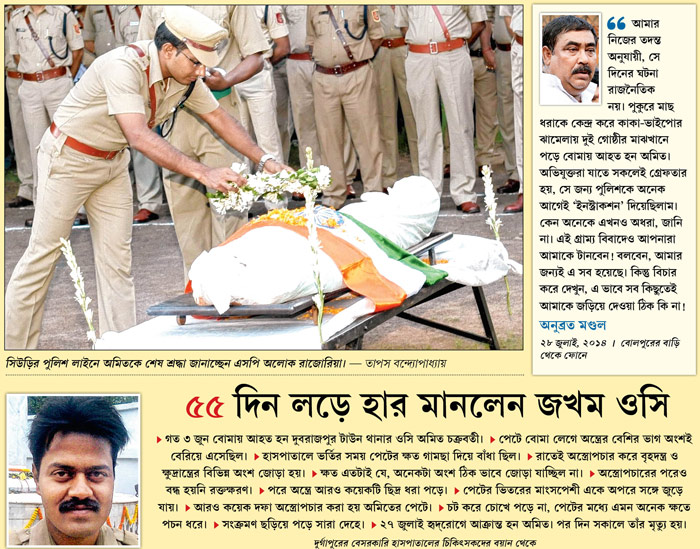অমিতের উপরে বোমা মারার ঘটনায় তৃণমূল এবং সিপিএম একে অন্যের বিরুদ্ধে অভিযোগ, পাল্টা অভিযোগ করেছিল। দুবরাজপুর থানার তৎকালীন ওসি ত্রিদিব প্রামাণিক দু’পক্ষের ৫০ জনের নামে এফআইআর দায়েরও করেন। তার ভিত্তিতে এ পর্যন্ত ১৭ জনকে গ্রেফতার করা হলেও এফআইআরের একেবারে প্রথম নামটি যাঁর ছিল, সেই আলিম কিন্তু অধরাই! অথচ ওই তৃণমূল নেতাকে রোজ পঞ্চায়েত সমিতির অফিসে দেখেছেন গ্রামবাসীরা। এমনকী, দলের নানা অনুষ্ঠানে তাঁর সক্রিয় উপস্থিতি নজর এড়ায়নি পুলিশেরও। কিন্তু তাঁকে ধরা হয়নি। আর সোমবার, অমিতের মৃত্যুর দিন বেলা বাড়তেই এলাকাছাড়া আলিম।