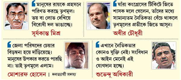 তবে নৈতিকতার ব্যাপারে মাথা ঘামাতে রাজি নয় শাসক দল। তাঁদের মতে, নৈতিকতার বিষয়টিই যদি মুখ্য তর্ক হবে, তা হলে দলত্যাগ সংক্রান্ত আইন থাকত না। মুর্শিদাবাদ জেলা পরিষদের দশ সদস্যকে এ দিন তপসিয়ায় তৃণমূল ভাবে আনুষ্ঠানিক ভাবে দলে সামিল করান শুভেন্দু অধিকারী। পরে তাঁর সাংবাদিক বৈঠকে নৈতিকতার প্রশ্ন উঠলে তিনি বলেন, ‘‘এখানে নৈতিকতার কোনও যুক্তি নেই। সংবিধান মেনে, দলত্যাগ বিরোধী আইন মেনে এই যোগদান হচ্ছে।’’ তাঁকে প্রশ্ন করা হয়, একের পর এক ভোটে মালদহ-মুর্শিদাবাদে বিশেষ সাফল্য না পেয়েই কি এই শর্টকাট রুট নিচ্ছে তৃণমূল? তাঁর জবাব, ‘‘২০১৩ সালের গাণিতিক সমীকরণ দিয়ে এখনকার সময় বিচার করবেন না। বিধানসভা ভোটে মুর্শিদাবাদে ৩২% ভোট পেয়েছে তৃণমূল।’’