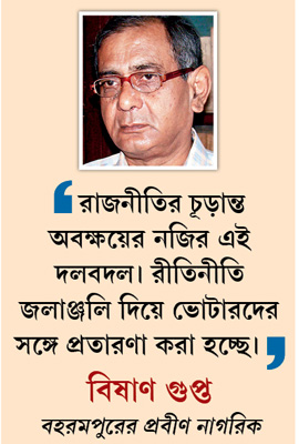 মুর্শিদাবাদকে যাঁর দুর্গ বলে গণ্য করা হয়, সেই প্রদেশ কংগ্রেস সভাপতি তথা বহরমপুরের সাংসদ অধীর চৌধুরী বলেন, ‘‘কী ভাবে পুলিশ-প্রশাসনকে ব্যবহার করে, টাকা-পয়সার লোভ দেখিয়ে দল ভাঙানো হচ্ছে, সবাই জানে। তবে জনপ্রতিনিধি চলে যাওয়া মানেই তো ভোটার চলে যাওয়া নয়। যাঁরা কংগ্রেসের টিকিটে জিতে শাসক দলে গেলেন, তাঁদের মধ্যে সামান্যতম নৈতিকতা বেঁচে থাকলে তৃণমূলের প্রতীকে জিতে আসুন।’’ দলছুটদের ‘বিশ্বাসঘাতক’ বলে তাঁদের প্রতি কিঞ্চিৎ অভিমানও করেছেন অধীর। তাঁর কথায়, ‘‘যাঁদের নাম পর্যন্ত মানুষ জানত না, যাঁদের বাড়ি থেকে বের করে এনে প্রার্থী করেছি, বুকের রক্ত উঠিয়ে ভোট করেছি তাঁরা বিশ্বাসঘাতকতা করলে দুঃখ তো হবেই।’’