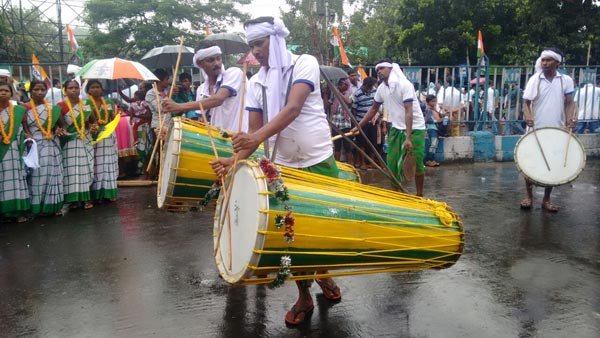 • ধামসা-মাদলের তালে নৃত্য চলছে সভাস্থলের সামনে।