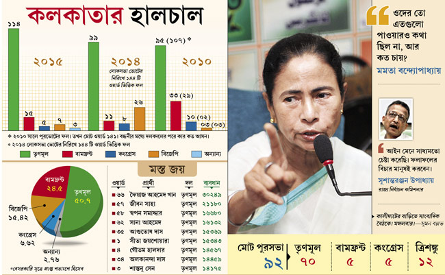 তবে নেত্রীর মনপসন্দ না হলেও যা হয়েছে, তা-ই বা কম কী! উদাহরণ হিসেবে কলকাতা পুরসভারই একাধিক ওয়ার্ডের ফল তুলে ধরছেন বিরোধীরা। যেমন, ৬৬ নম্বর ওয়ার্ড। সেখানে ৩০ হাজারের বেশি ভোটে জিতেছেন তৃণমূল প্রার্থী ফৈয়াজ আহমেদ খান। যা দেখে দলের নেতারাই বলছেন, এ তো বাম আমলে কেশপুরে নন্দরানি ডলের জয়কে ছাপিয়ে যাওয়ার জোগাড়। ফৈয়াজ একা নন। ১০ হাজারের বেশি ভোটের ব্যবধানে জিতেছেন শাসক দলের আরও ১৪ জন প্রার্থী। এবং যার জেরে কলকাতা শহরে তৃণমূলের ভোট গত লোকসভা নির্বাচনের থেকে ১৩ শতাংশেরও বেশি বেড়ে ৫০.৭ শতাংশ হয়ে গিয়েছে বলে বিরোধীদের অভিযোগ।