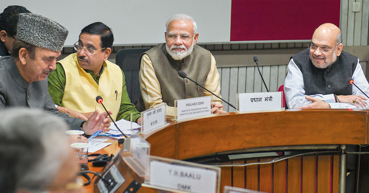 সর্বদলীয় বৈঠকে প্রধানমন্ত্রী নরেন্দ্র মোদী ও কেন্দ্রীয় স্বরাষ্ট্রমন্ত্রী অমিত শাহের সঙ্গে কংগ্রেস নেতা গুলাম নবি আজাদ (বাঁ দিকে) এবং সংসদ বিষয়ক মন্ত্রী প্রহ্লাদ জোশী। রবিবার সংসদে। ছবি: পিটিআই।