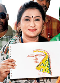 মুখ্যমন্ত্রীর আঁকা ছবি হাতে নবান্নে নয়না বন্দ্যোপাধ্যায়। ছবি: সুদীপ আচার্য