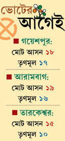 ঘটনা হল, কলেজ নির্বাচন ছাড়া জনপ্রতিনিধি নির্বাচনে বরাবরই সন্ত্রাস চালিয়ে মনোনয়ন প্রত্যাহারের সিংহ ভাগ অভিযোগ উঠেছে গ্রামাঞ্চলে। এ বারে যে ভাবে পুর এলাকাতেও তা ছায়া ফেলল এবং তিন পুরসভা কার্যত বিনা লড়াইয়ে শাসক দলের হাতে গেল, তাতে বিরোধী শিবির কিছুটা হতবাক। এ দিন বিরোধীরা মনোনয়ন প্রত্যাহার করার হুগলির যে দু’টি পুরসভা তৃণমূল কার্যত বিনা যুদ্ধে দখল করল, সেই আরামবাগ এবং তারকেশ্বর অবশ্য তাদের দখলেই ছিল। আরামবাগ পুরসভায় মোট আসন ১৯। বিরোধীরা ১৬টিতে মনোনয়ন প্রত্যাহার করেছে। ভোট হবে শুধু ১, ৬ এবং ১৯ নম্বর ওয়ার্ডে। তারকেশ্বর পুরসভায় মোট আসন ১৫। দু’টিতে মনোনয়নই জমা দেননি বিরোধীরা। আটটি থেকে তারা মনোনয়ন প্রত্যাহার করেছেন। ভোট হবে ১, ৩, ১৫, ১৩ এবং ১১ নম্বর ওয়ার্ডে। গয়েশপুর পুরসভার ১৮টি ওয়ার্ডে এ বার ভোট হচ্ছিল। তার মধ্যে ১৭টিতে বিজেপি, বামেরা ১৫টিতে, কংগ্রেস ১১টিতে এবং নির্দল ২টিতে প্রার্থী দিয়েছিল। তৃণমূল সবক’টিতেই প্রার্থী দিয়েছিল। ১৪ নম্বর ওয়ার্ডের নির্দল প্রার্থী নিখিল গায়েন ছাড়া এ দিন বাকি সমস্ত ওয়ার্ডে বিরোধীদের প্রার্থীরা মনোনয়ন প্রত্যাহার করে নেন। নিখিল গায়েন আবার বিক্ষুব্ধ তৃণমূল। ফলে, গয়েশপুর বামেদের হাতছাড়া হল।