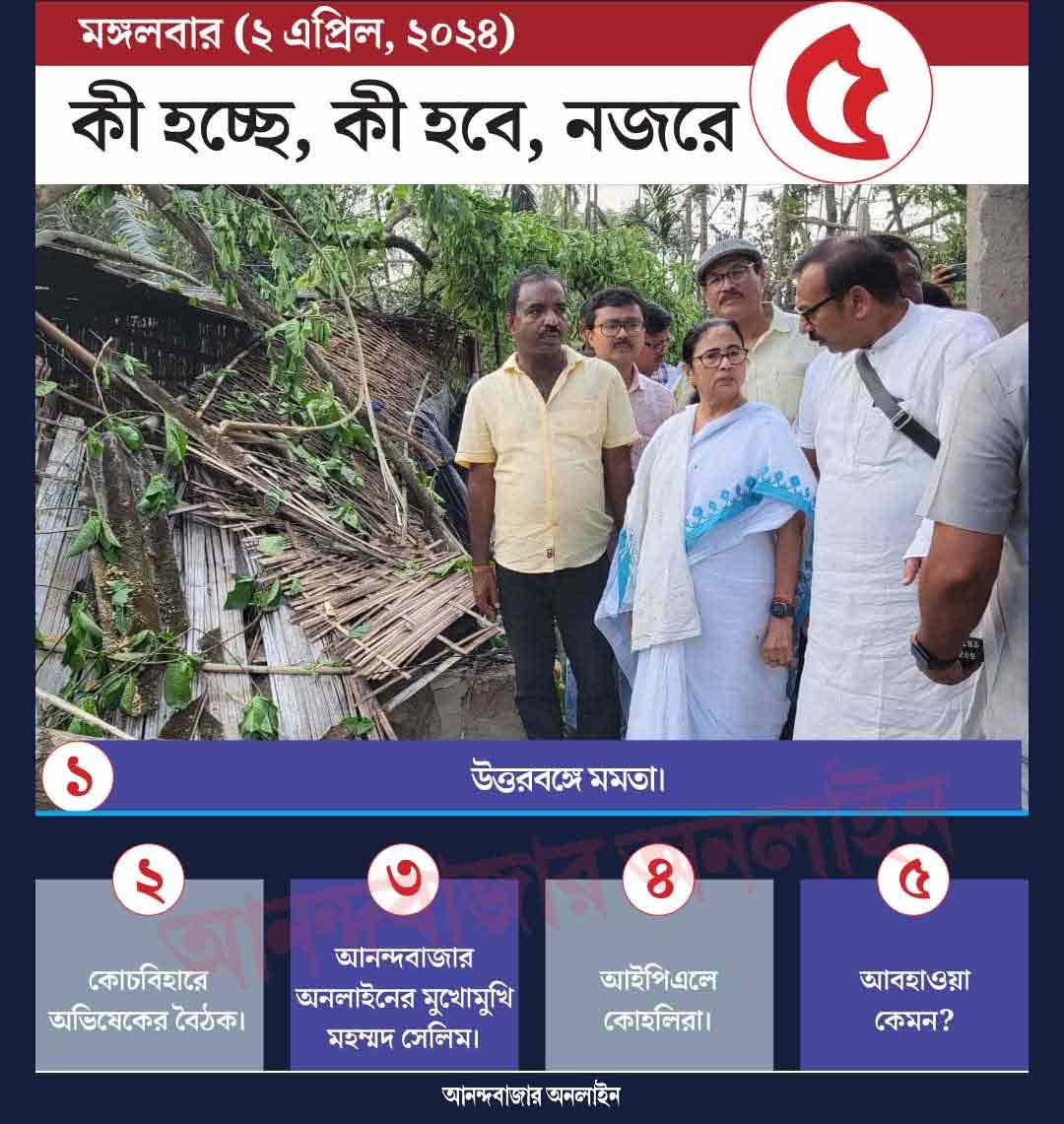 ভোটপ্রচারে উত্তরবঙ্গে যাওয়ার কথা ছিল আগামী বুধবার, ৩ এপ্রিল। কিন্তু ঘূর্ণিঝড়ে বিপর্যয়ের খবর পাওয়া মাত্রই রবিবার রাতে জলপাইগুড়ি পৌঁছে গিয়েছেন মুখ্যমন্ত্রী মমতা বন্দ্যোপাধ্যায়। নবান্ন সূত্রে খবর, এখন আর কলকাতা ফিরছেন না মুখ্যমন্ত্রী। বুধবার পর্যন্ত জলপাইগুড়িতেই তাঁর থাকার কথা। জেলা পুলিশ প্রশাসন সূত্রে খবর, রবিবার রাতে জলপাইগুড়ির চালসার একটি হোটেলে উঠেছিলেন মুখ্যমন্ত্রী। সেখান থেকেই জলপাইগুড়ির পরিস্থিতির দিকে নজর রাখছেন, সবটা পরিচালনাও করছেন। মঙ্গলবারও চালসাতেই থাকার কথা তাঁর।