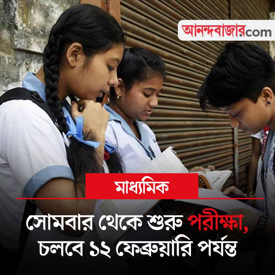 ২০২৬ সালের মাধ্যমিক পরীক্ষা শুরু হচ্ছে সোমবার, ২ ফেব্রুয়ারি। পরীক্ষা চলবে বৃহস্পতিবার, ১২ ফেব্রুয়ারি পর্যন্ত। সকাল ১০টা ৪৫ মিনিট থেকে দুপুর ২টো পর্যন্ত পরীক্ষা নেওয়া হবে। প্রথম ১৫ মিনিট পরীক্ষার্থীদের জন্য শুধু প্রশ্নপত্র পড়ার সময় হিসেবে বরাদ্দ থাকবে। পর্ষদের সূচি অনুযায়ী, ২ ফেব্রুয়ারি প্রথম ভাষার পরীক্ষা রয়েছে। ৩ ফেব্রুয়ারি দ্বিতীয় ভাষা। এর পর ৬ ফেব্রুয়ারি ইতিহাস, ৭ ফেব্রুয়ারি ভূগোল। ৯ ফেব্রুয়ারি অঙ্ক, ১০ ফেব্রুয়ারি পদার্থবিজ্ঞান এবং ১১ ফেব্রুয়ারি জীববিজ্ঞান পরীক্ষা হবে। শেষ দিন, ১২ ফেব্রুয়ারি ঐচ্ছিক বিষয়গুলির পরীক্ষা। পর্ষদ সূত্রে জানানো হয়েছে, পরীক্ষার্থীদের নির্ধারিত সময়ের অনেক আগে পরীক্ষাকেন্দ্রে পৌঁছোতে হবে। সঙ্গে রাখতে হবে অরিজিনাল অ্যাডমিট কার্ড, স্কুল আইডি কার্ড এবং অনুমোদিত লেখার সামগ্রী। পরীক্ষাকেন্দ্রে কোনও রকম অনিয়ম বরদাস্ত করা হবে না বলেও জানানো হয়েছে।