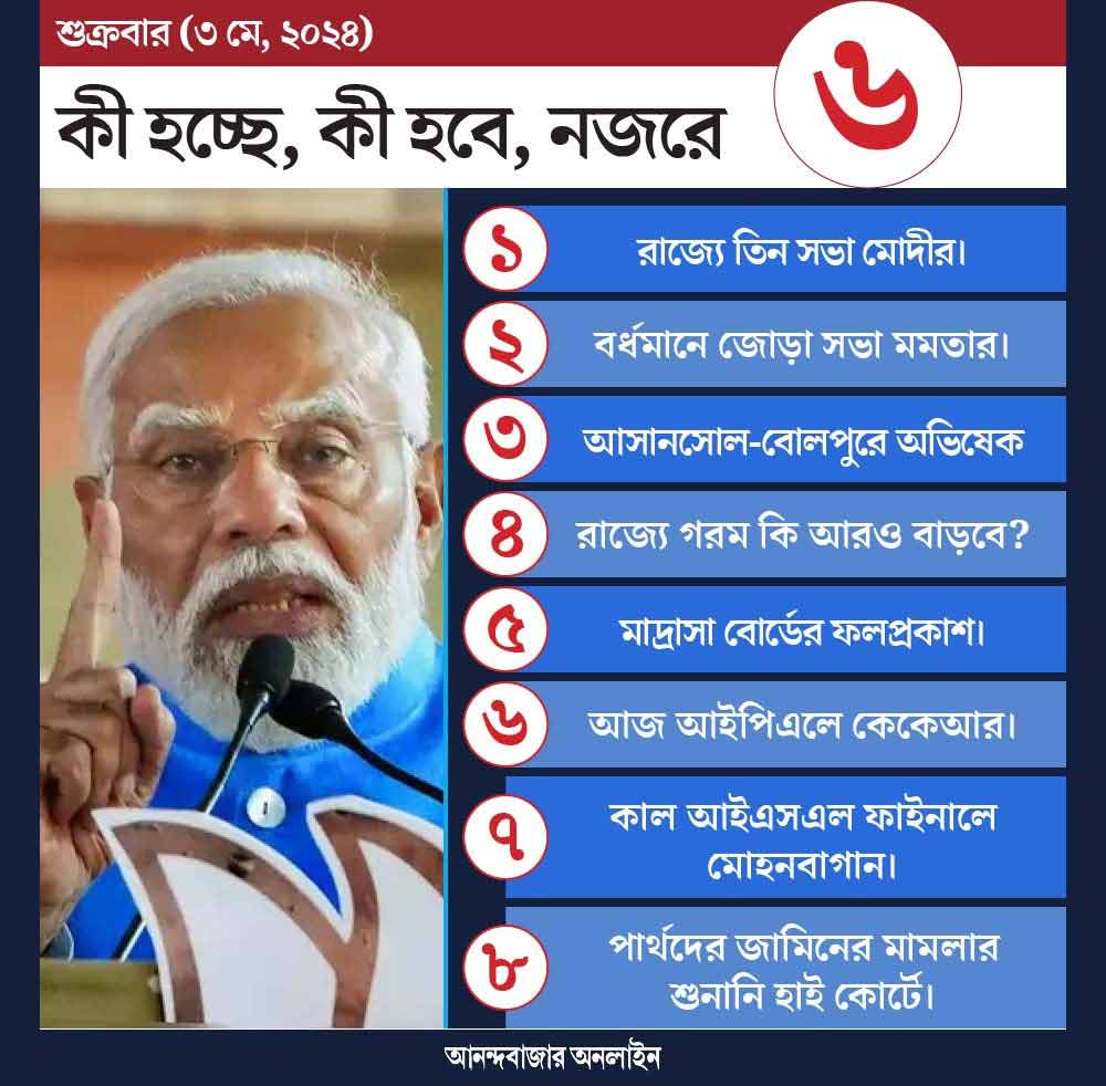 বৃহস্পতিবার রাতেই মোদী কলকাতায় চলে এসেছেন। রাত কাটিয়েছেন রাজভবনে। আজ সকালে সেখান থেকে তিনি রওনা দেবেন বর্ধমানের উদ্দেশে। তার পরে কৃষ্ণনগরে সভা করবেন মোদী। দিনের শেষ তথা তৃতীয় সভাটি মোদী করবেন বোলপুরে।