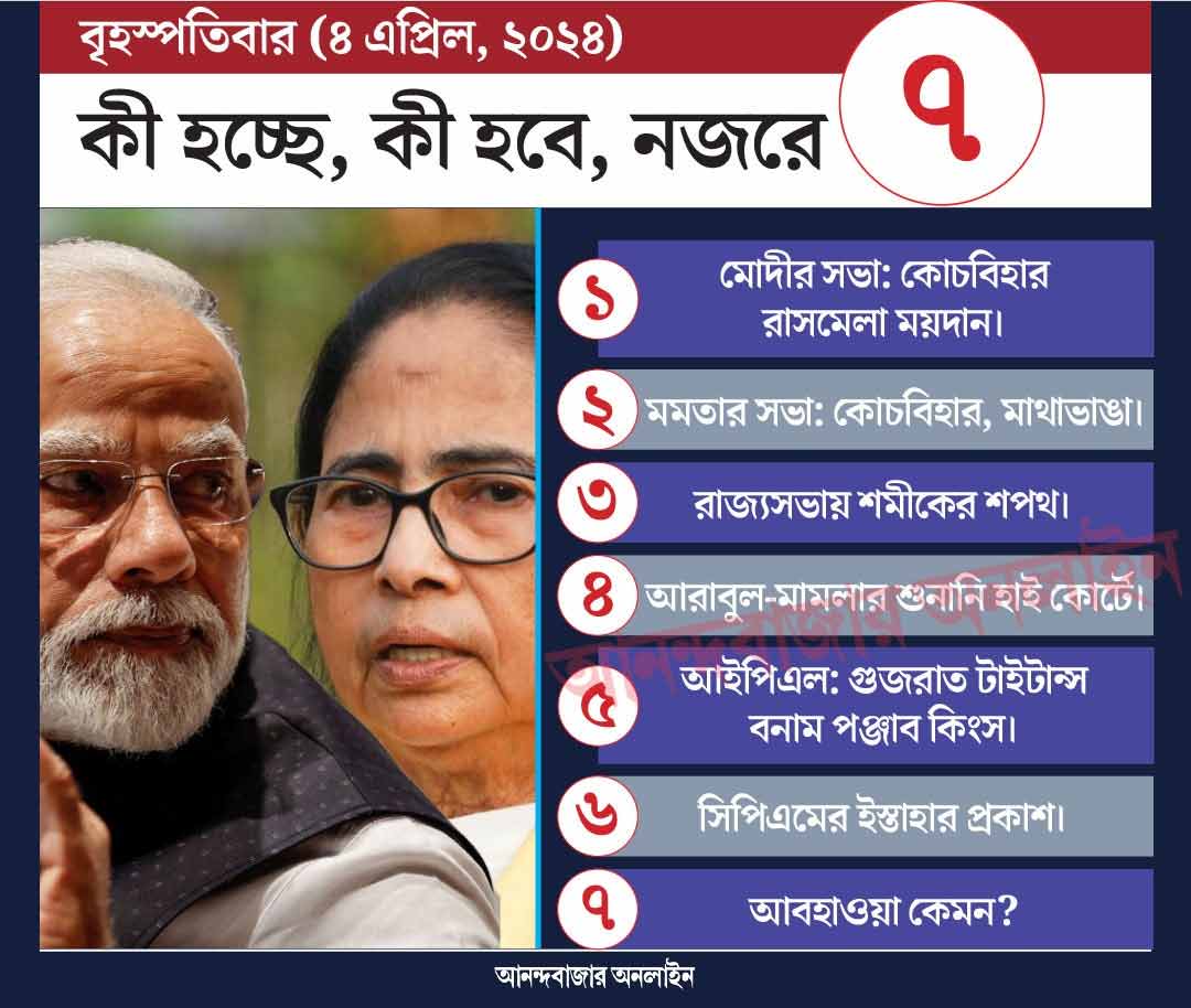 মার্চে এ রাজ্যের আরামবাগ, কৃষ্ণনগর, বারাসত ও শিলিগুড়িতে সভা করে গিয়েছেন প্রধানমন্ত্রী। লোকসভা ভোটের নির্ঘণ্ট ঘোষণার পর আজই প্রথম রাজ্যে আসছেন মোদী। আজ বিকেল ৩টেয় কোচবিহারের রাসমেলা ময়দানে জনসভা করবেন তিনি।