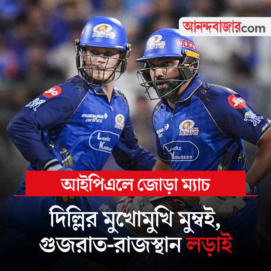আইপিএলে আজ জোড়া ম্যাচ। নামছে চার দল। তার মধ্যে তিনটি দল প্রথম ম্যাচে জিতেছে, একটি দল হেরেছে। প্রথমে দিল্লি ক্যাপিটালস খেলবে মুম্বই ইন্ডিয়ান্সের সঙ্গে। অক্ষর পটেলের দিল্লি প্রথম ম্যাচে হারিয়েছে লখনউ সুপার জায়ান্টসকে। হার্দিক পাণ্ড্যর মুম্বই জিতেছে কলকাতা নাইট রাইডার্সের বিরুদ্ধে। আজ কারা অপরাজিত থাকবে? দিল্লিতে খেলা শুরু বিকেল ৩:৩০ থেকে। এরপর লড়াই গুজরাত টাইটান্স ও রাজস্থান রয়্যালসের। শুভমন গিলের গুজরাত প্রথম ম্যাচে হেরেছে পঞ্জাব কিংসের কাছে। অন্য দিকে রাজস্থান তাদের প্রথম ম্যাচে উড়িয়ে দিয়েছে চেন্নাই সুপার কিংসকে। এই ম্যাচ অহমদাবাদে সন্ধ্যা ৭:৩০ থেকে। খেলা দেখা যাবে স্টার স্পোর্টস চ্যানেল ও জিয়োহটস্টার অ্যাপে।