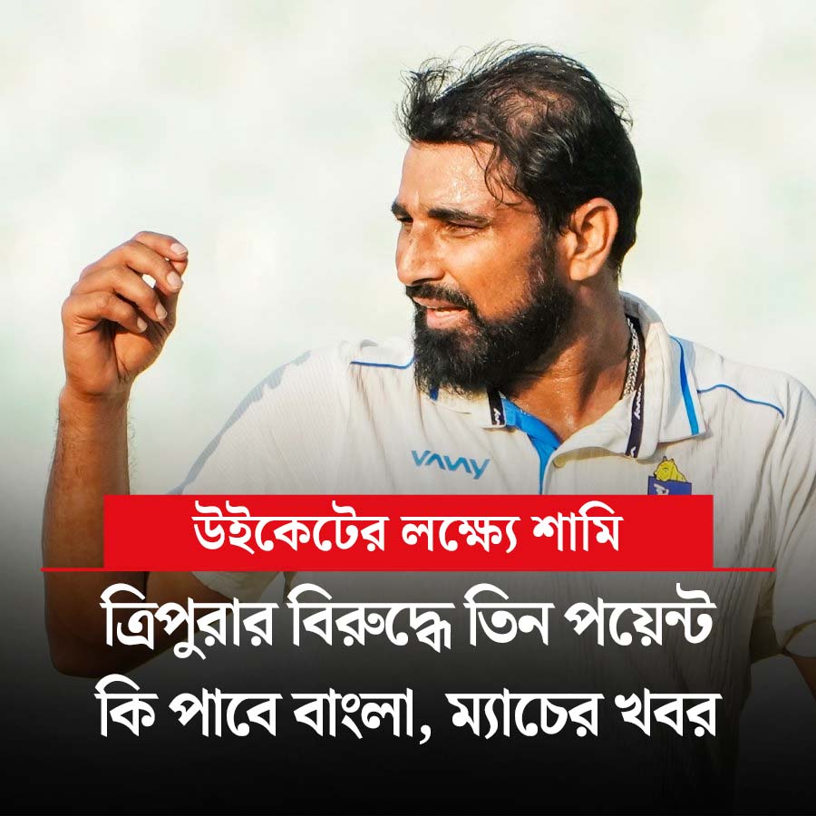 রঞ্জি ট্রফিতে আজ বাংলার সামনে কঠিন লড়াই। ত্রিপুরার বিরুদ্ধে তিন পয়েন্ট না-ও পেতে পারে বাংলা। প্রথম ইনিংসে বাংলার ৩৩৬ রানের জবাবে তৃতীয় দিনের শেষে ত্রিপুরা ৭ উইকেটে ২৭৩ রান তুলেছে। তারা আর ৬৩ রান তুলে ফেলতে পারলেই বাংলা এই ম্যাচ থেকে তিন পয়েন্ট পাবে না। এক পয়েন্ট নিয়েই সন্তুষ্ট থাকতে হবে। মহম্মদ শামি ১৯ ওভার বল করেও কোনও উইকেট পাননি। তিনি কি তিন পয়েন্ট এনে দিতে পারবেন? খেলা শুরু সকাল ৮:৪৫ থেকে। খেলা দেখা যাবে জিয়োহটস্টার অ্যাপে।