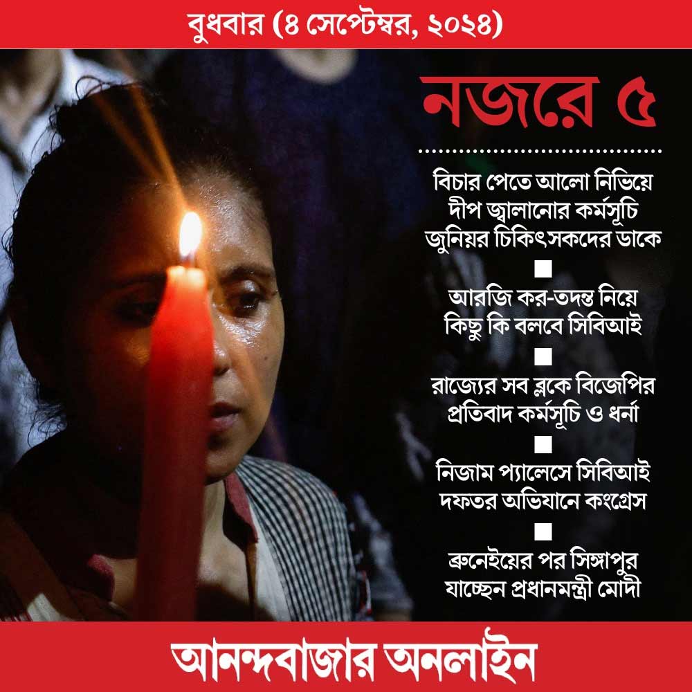 আরজি কর-কাণ্ডের প্রতিবাদে সোমবার রাজ্যের সব জেলায় বিজেপির কর্মসূচি ছিল। মঙ্গলবার দলের রাজ্য সভাপতি সুকান্ত মজুমদারের জেলা দক্ষিণ ২৪ দিনাজপুরে ছিল জেলাশাসকের দফতর ঘেরাও কর্মসূচি। আজ রাজ্যের সব ব্লকে বিজেপির প্রতিবাদ কর্মসূচি রয়েছে। দল সিদ্ধান্ত নিয়েছে, সব ব্লক দফতরে ধর্নায় বসবেন নেতা-কর্মীরা। আজ রাত ৯টা থেকে ১০টা গোটা রাজ্যে বাড়ির আলো নিভিয়ে রাখার ডাক দিয়েছে জুনিয়র চিকিৎসকদের সংগঠন। সেই কর্মসূচিকেও সমর্থন করেছে বিজেপি।