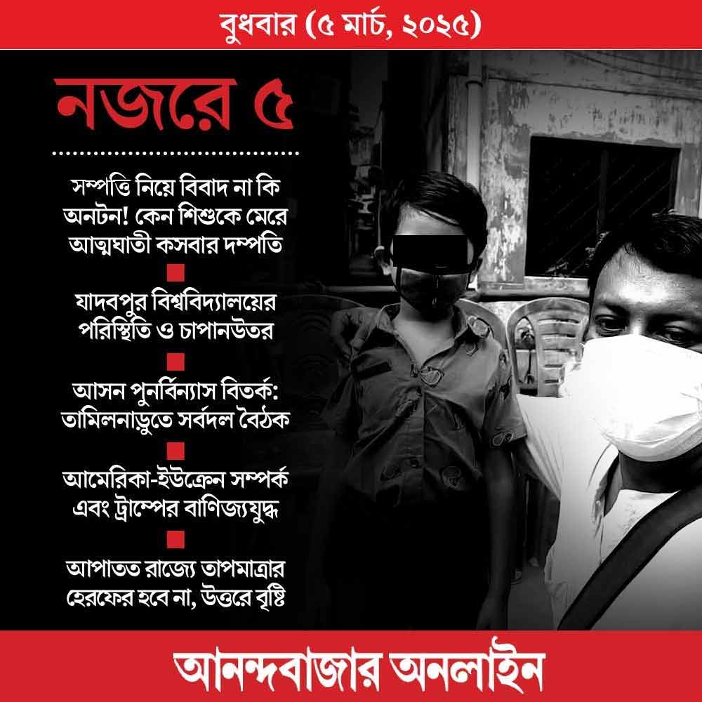মঙ্গলবার সকালে কসবার হালতুতে সোমনাথ রায়, তাঁর স্ত্রী সুমিত্রা রায় এবং তাঁদের আড়াই বছরের পুত্রের দেহ উদ্ধার হয়। ছেলের দেহ নিজের সঙ্গে বেঁধে গলায় ফাঁস দিয়েছিলেন সোমনাথ। তাঁর স্ত্রীও গলায় ফাঁস দেন। সুমিত্রার পরিবারের দাবি, সম্পত্তি নিয়ে বিবাদের কারণেই আত্মঘাতী হয়েছেন ওই দম্পতি। তারা আঙুল তুলেছেন সোমনাথের মামা-মামির দিকে। ওই দু’জনকে গ্রেফতার করা হয়েছে। ধৃত দু’জনকে জেরা করেই কি মিলবে আরও তথ্য? জানা যাবে আত্মহত্যার কারণ? আজ নজর থাকবে এই ঘটনার তদন্তে।