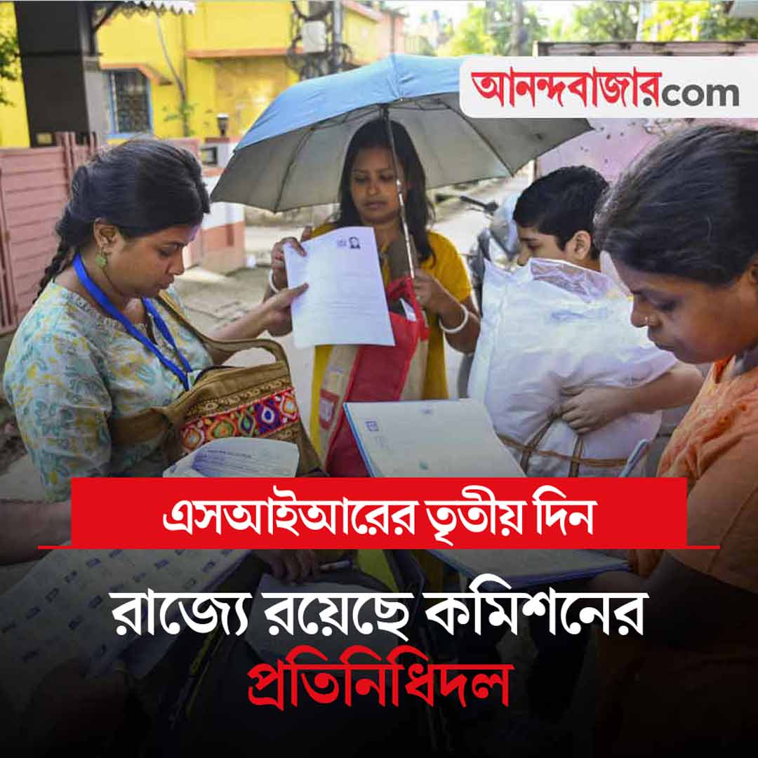রাজ্যে এসআইআরের তৃতীয় দিন। বুধবার বিকেল ৫টা পর্যন্ত ৮৪ লক্ষ এনুমারেশন ফর্ম বিতরণ করেছেন বিএলও-রা। আজ তৃতীয় দিনে উত্তরবঙ্গের জেলায় ঘুরবে নির্বাচন কমিশনের প্রতিনিধিদল। এসআইআর খতিয়ে দেখতে দিল্লি থেকে ওই দল এসেছে রাজ্যে। প্রতিনিধি দলে রয়েছেন ডেপুটি কমিশনার জ্ঞানেশ ভারতী, ডেপুটি সেক্রেটারি অভিনব আগরওয়াল এবং প্রিন্সিপাল সেক্রেটারি এসবি জোশি। শুক্রবার পর্যন্ত তাঁরা রাজ্যে থাকবেন। উত্তরবঙ্গের তিন জেলা কোচবিহার, আলিপুরদুয়ার এবং জলপাইগুড়িতে এসআইআর পর্যালোচনা করবে কমিশনের প্রতিনিধি দল। আজ নজর থাকবে এসআইআর সংক্রান্ত খবরের দিকে।