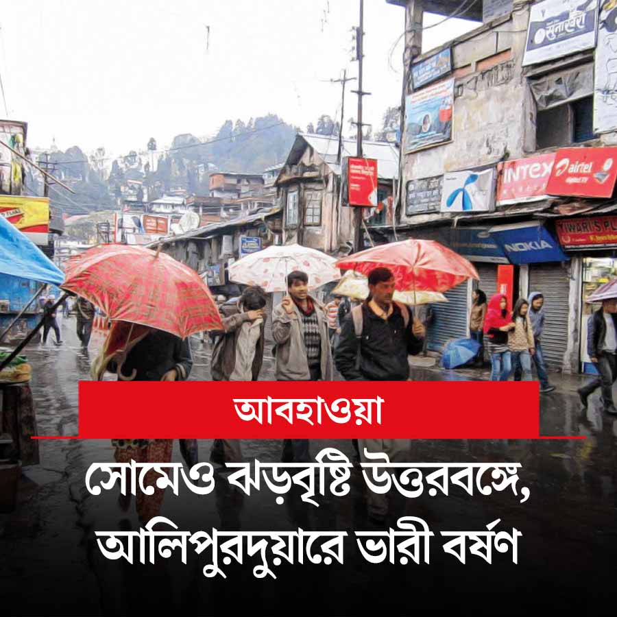 আলিপুর আবহাওয়া দফতর বলছে, আজও ঝড়বৃষ্টির সম্ভাবনা রয়েছে উত্তরবঙ্গের আট জেলায়। ওই জেলাগুলিতে হলুদ সতর্কতা জারি করা হয়েছে। হালকা থেকে মাঝারি বৃষ্টির পাশাপাশি ঘণ্টায় ৩০ থেকে ৪০ কিলোমিটার গতিতে ঝোড়ো হাওয়ার পূর্বাভাস রয়েছে। তবে জেলার সব জায়গায় ঝড়বৃষ্টি হবে না। উত্তরের আট জেলার মধ্যে সোমবার আলিপুরদুয়ারে হতে পারে ভারী বৃষ্টি। মঙ্গলবার থেকে বৃষ্টি কমবে উত্তরবঙ্গে। ওই দিন একমাত্র দক্ষিণ দিনাজপুর, মালদহে হালকা থেকে মাঝারি বৃষ্টির পাশাপাশি ঝোড়ো হাওয়ার জন্য হলুদ সতর্কতা জারি করা হয়েছে। দক্ষিণবঙ্গেও বিক্ষিপ্ত বৃষ্টির সম্ভাবনা রয়েছে।