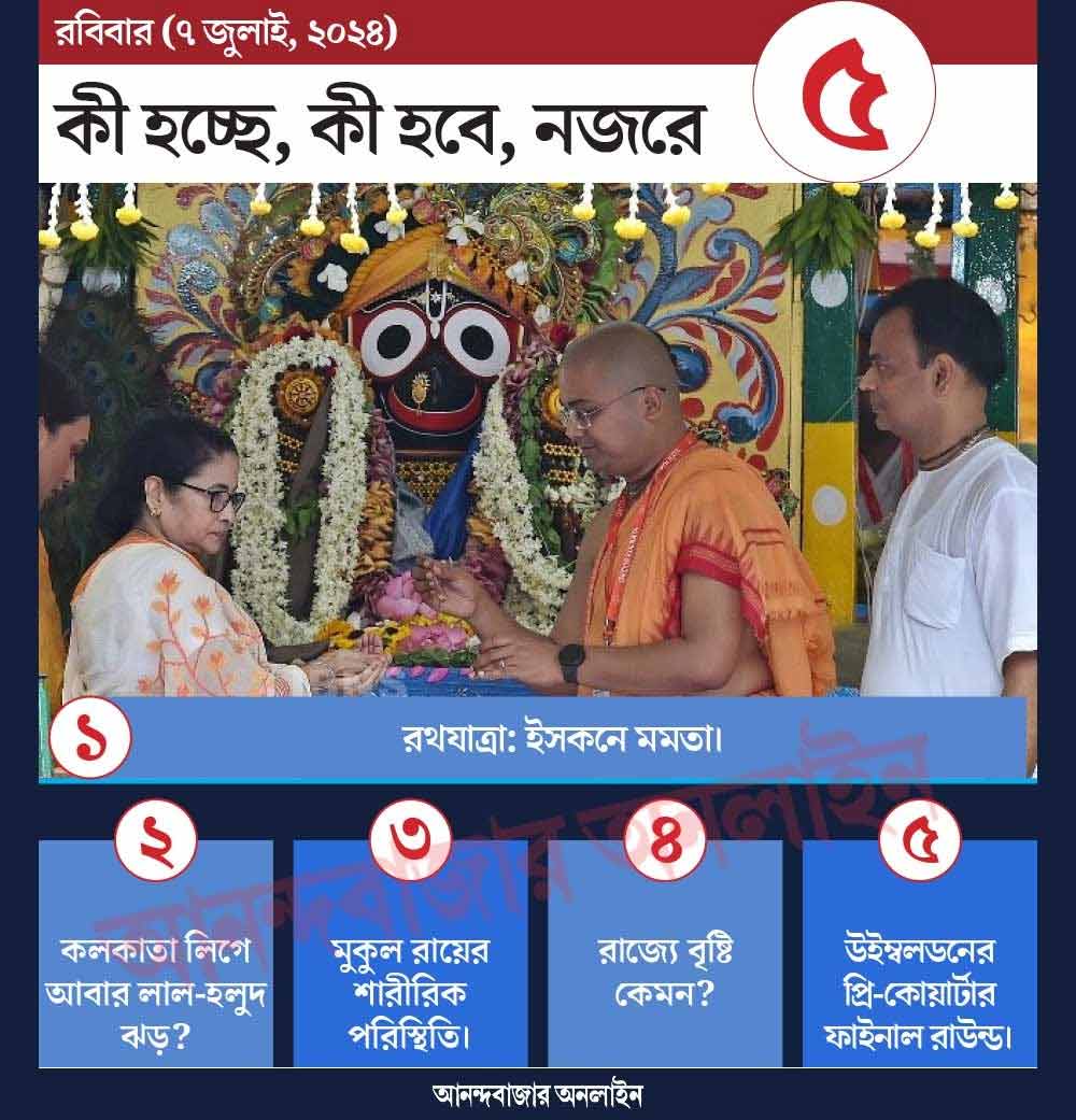 কলকাতায় আজ রথযাত্রার আয়োজন করেছে ইসকনও। তাদের তরফে মুখ্যমন্ত্রী মমতা বন্দ্যোপাধ্যায়কে রথের রশিতে টান দিতে আমন্ত্রণ জানানো হয়েছে। দুপুর ২টোয় মমতা ইসকনের রথযাত্রায় অংশ নিতে যাবেন। আগেও বেশ কয়েক বার এই রথযাত্রায় অংশ নিয়েছেন তিনি।
