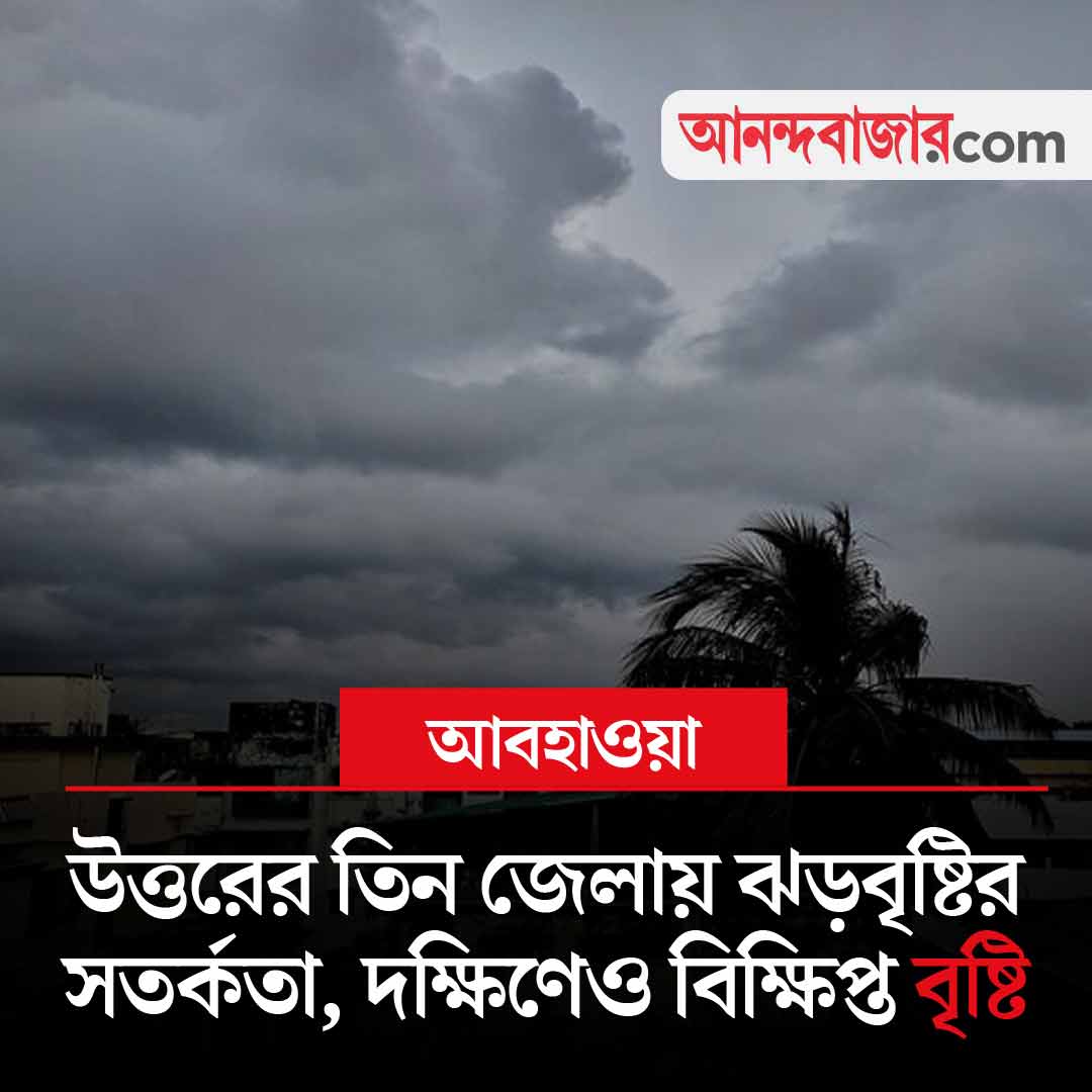 আজ উত্তরবঙ্গের আট জেলাতেই হালকা থেকে মাঝারি বৃষ্টি হতে পারে। তবে বিক্ষিপ্ত ভাবে। জেলার সব জায়গায় হবে না। দার্জিলিং, জলপাইগুড়ি, কোচবিহার— এই তিন জেলায় হালকা থেকে মাঝারি বৃষ্টির সঙ্গে ঘণ্টায় ৩০ থেকে ৪০ কিলোমিটার গতিতে ঝোড়ো হাওয়া বইতে পারে। ওই তিন জেলায় হলুদ সতর্কতা জারি করা হয়েছে। কলকাতা-সহ দক্ষিণবঙ্গের সব জেলায় আজ বিক্ষিপ্ত ভাবে হালকা থেকে মাঝারি বৃষ্টি হতে পারে। জেলার সব জায়গায় হবে না। হুগলি, উত্তর ও দক্ষিণ ২৪ পরগনা, পূর্ব ও পশ্চিম মেদিনীপুর, পূর্ব বর্ধমান, নদিয়ায় বৃষ্টির পাশাপাশি, ঘণ্টায় ৩০ থেকে ৪০ কিলোমিটার গতিতে ঝোড়ো হাওয়া বইতে পারে। ওই জেলাগুলিতে হলুদ সতর্কতা জারি করা হয়েছে।