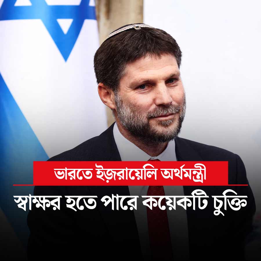 তিন দিনের সফরে আজ ভারতে আসছেন ইজ়রায়েলের অর্থমন্ত্রী বেজ়ালেল স্মোট্রিচ। এই সফরকালে ভারতের অর্থমন্ত্রী নির্মলা সীতারমণ, বাণিজ্যমন্ত্রী পীযূষ গয়াল এবং আবাসন ও নগরোন্নয়ন মন্ত্রী মনোহরলাল খট্টরের সঙ্গে বৈঠকের কথা রয়েছে তাঁর। ভারত এবং ইজ়রায়েলের মধ্যে মুক্ত বাণিজ্যচুক্তি এবং দ্বিপাক্ষিক বিনিয়োগ চুক্তির বিষয়েও আলোচনা হওয়ার কথা রয়েছে। ইজ়রায়েলি মন্ত্রীর সফরকালেই চূড়ান্ত হয়ে যেতে পারে দ্বিপাক্ষিক বিনিয়োগ চুক্তি।