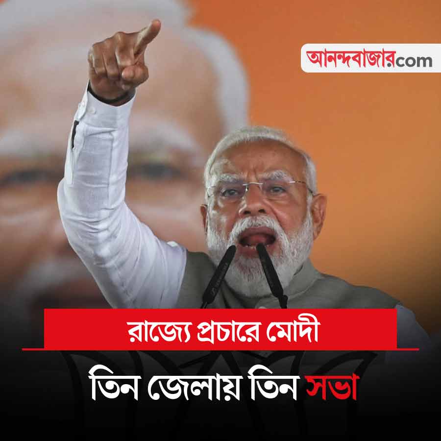 বিধানসভা ভোটের প্রচারে ফের রাজ্যে আসছেন প্রধানমন্ত্রী নরেন্দ্র মোদী। বৃহস্পতিবার তিন জেলায় তাঁর তিনটি জনসভা রয়েছে। প্রথম সভাটি রয়েছে পূর্ব মেদিনীপুরের হলদিয়ায়। দ্বিতীয়টি পশ্চিম বর্ধমানের আসানসোলে। তৃতীয়টি বীরভূমের সিউড়িতে। এর আগে গত রবিবার কোচবিহারের জনসভা থেকে রাজ্য সরকার এবং তৃণমূলের বিরুদ্ধে একের পর এক আক্রমণ শানিয়েছেন তিনি। এ বার তিন জেলা ঘুরে প্রধানমন্ত্রী কী বার্তা দেন দলীয় কর্মী-সমর্থকদের, সে দিকে নজর থাকবে আজ।
