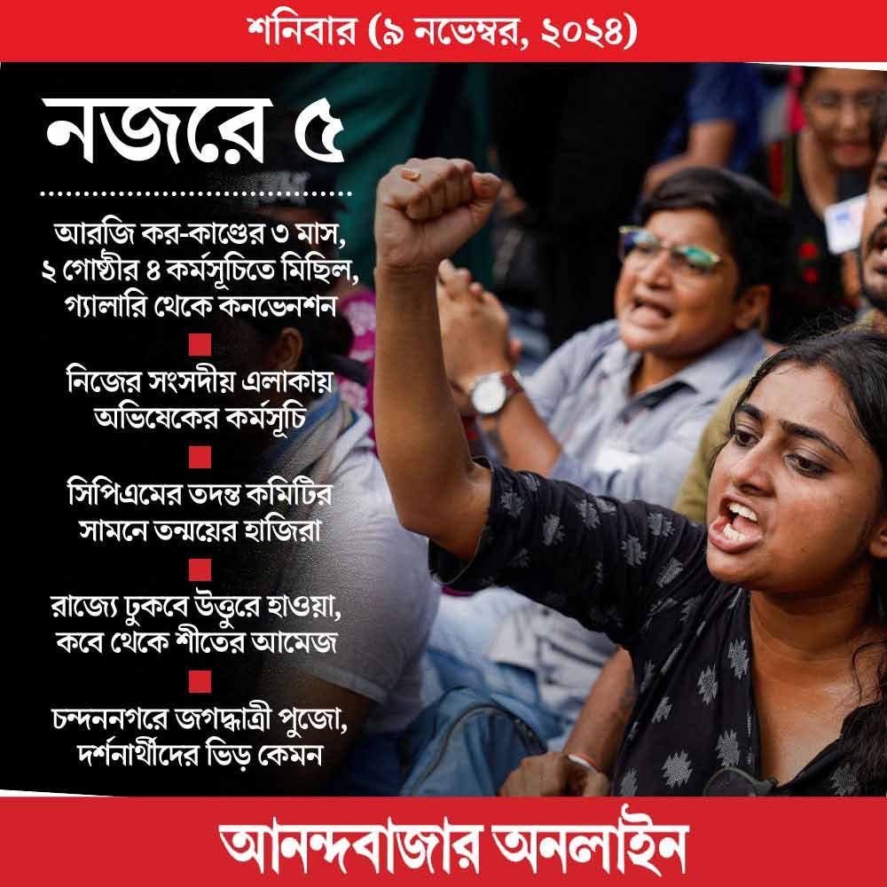আজ আরজি কর-কাণ্ডের তিন মাস পূর্ণ হওয়ার দিনে কলকাতা-সহ রাজ্যের বিভিন্ন মেডিক্যাল কলেজে ‘দ্রোহের গ্যালারি’ করার ডাক দিয়েছেন জুনিয়র ডক্টর্স’ ফ্রন্টের সদস্যেরা। নির্যাতিতা চিকিৎসকের জন্য ন্যায়বিচারের দাবিতে আজ দুপুর ৩টের সময় কলেজ স্কোয়্যার থেকে ধর্মতলা পর্যন্ত মিছিলের ডাক দিয়েছেন ফ্রন্টের সদস্যেরা। শনিবার দুপুরে ধর্মতলায় ‘জনতার চার্জশিট’ কর্মসূচির ডাক দিয়েছে ‘অভয়া মঞ্চ’। একই দিনে গণ কনভেনশনের ডাক দিয়েছেন জুনিয়র ডাক্তার অ্যাসোসিয়েশনের সদস্যেরা। স্টার থিয়েটারে হবে সেই কনভেনশন। আজ এই সংক্রান্ত খবরে নজর থাকবে।