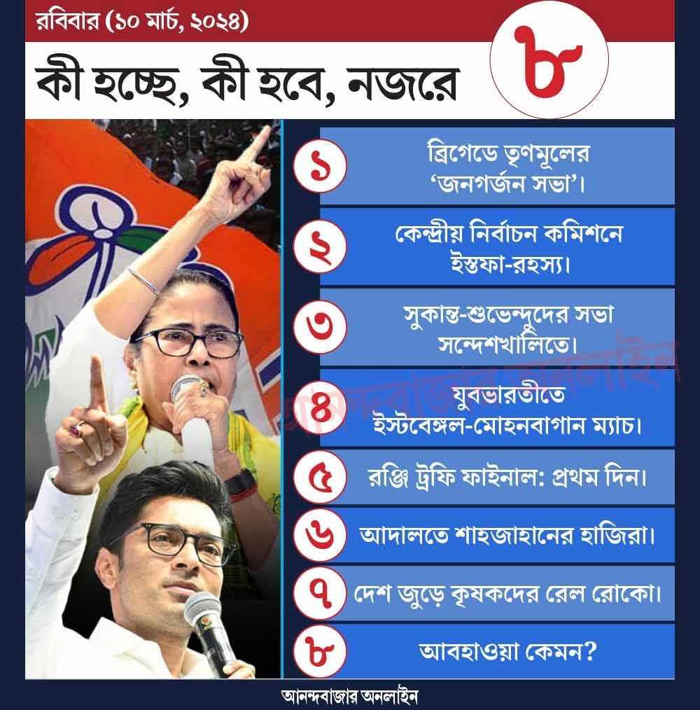সব কিছু ঠিক থাকলে আগামী সপ্তাহে লোকসভা নির্বাচনের দিনক্ষণ ঘোষণা হয়ে যাওয়ার কথা ছিল। তার ঠিক আগেই শনিবার আচমকা নির্বাচন কমিশনারের পদ থেকে ইস্তফা দিয়েছেন অরুণ গোয়েল। দেশে মুখ্য নির্বাচন কমিশনার-সহ মোট তিন জন নির্বাচন কমিশনারের থাকার কথা। এত দিন মুখ্য নির্বাচন কমিশনার রাজীব এবং নির্বাচন কমিশনার অরুণই দায়িত্ব সামলাচ্ছিলেন। হঠাৎ কেন ইস্তফা? কমিশন ভোটের আগে কি চাপে? তা নিয়ে নানা মহল থেকে বিভিন্ন প্রশ্ন উঠেছে। আজ এই সংক্রান্ত খবরে নজর থাকবে। পাশাপাশি, আজ রাজ্যের শাসকদল তৃণমূলের ‘জনগর্জন সভা’ ব্রিগেডে। ভোটের আগে এটাই তৃণমূলের শেষ কেন্দ্রীয় বড় সমাবেশ। এর পর দলনেত্রী মমতা বন্দ্যোপাধ্যায় এবং সেনাপতি অভিষেক বন্দ্যোপাধ্যায় বেরিয়ে পড়বেন জেলায় জেলায় প্রচারে। ব্রিগেডে মমতা, অভিষেক কী বলেন সে দিকে নজর থাকবে রাজনৈতিক মহলের। বস্তুত, আজকের ব্রিগেড থেকেই দলকে লোকসভার সুর বেঁধে দেবেন মমতা এবং অভিষেক। এই ধরনের যে কোনও বড় সভাতে তৃণমূলের চমকের দিকে নজর থাকে। কোনও বিশিষ্ট ব্যক্তি বা অন্য দলের কেউ যোগ দিচ্ছেন কি না নজর থাকে সে দিকে। আজও তার অন্যথা হবে না। ব্রিগেডের মঞ্চে তৃণমূল আর কী কী করে বা বলে, ভোটের আগে বড় কোনও ঘোষণা ব্রিগেডের মঞ্চ থেকেই দিদি এবং অভিষেক করে দেবেন কি না, তা নিয়েও কৌতূহল রয়েছে।