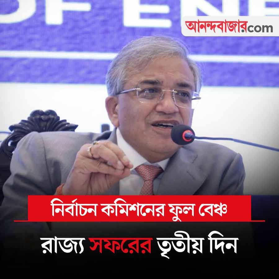 সফরের তৃতীয় দিনে আজ সকালে প্রথমে মুখ্য নির্বাচন কমিশনার জ্ঞানেশ কুমার বেলুড় মঠে যাবেন। তার পর রাজ্যের মুখ্যসচিব নন্দিনী চক্রবর্তীর সঙ্গে বৈঠক করবে কমিশনের ফুল বেঞ্চ। সকাল সাড়ে ১০টা নাগাদ নিউ টাউনের একটি হোটেলে ওই বৈঠক শুরু হবে। কমিশন সূত্রে খবর, আজ মুখ্যসচিবের পাশাপাশি, রাজ্য পুলিশের ডিজি, মুখ্য নির্বাচনী আধিকারিক, রাজ্য পুলিশ এবং কেন্দ্রীয় বাহিনীর নোডাল অফিসারদের সঙ্গে বৈঠক করবে কমিশন। দুপুর সাড়ে ১২টা নাগাদ জ্ঞানেশ কুমার-সহ কমিশনের ফুল বেঞ্চ সাংবাদিক বৈঠক করবে। বিকেলে তারা দিল্লির উদ্দেশে রওনা হবে।