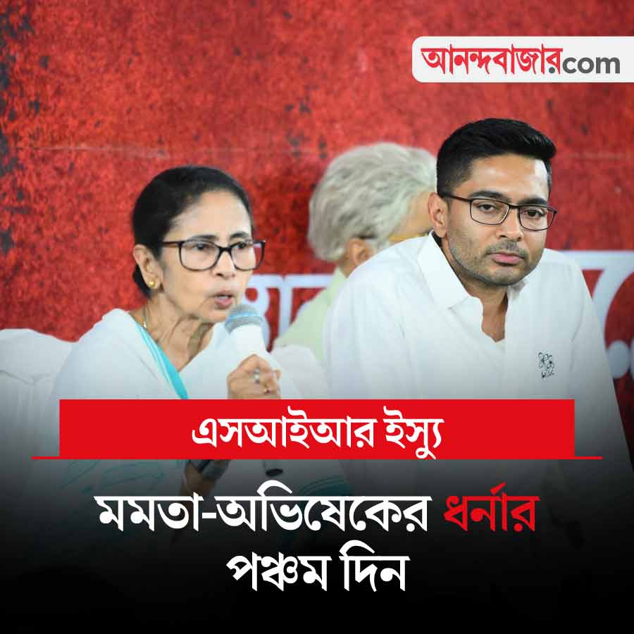 শুক্রবার থেকে কলকাতার ধর্মতলার মেট্রো চ্যানেলে ধর্না কর্মসূচি শুরু করেছে তৃণমূল। এসআইআর ইস্যুতে বিজেপি এবং নির্বাচন কমিশনের বিরুদ্ধে বিভিন্ন অভিযোগ তৃণমূলনেত্রী মমতা বন্দ্যোপাধ্যায় এবং ওই দলের দ্বিতীয় গুরুত্বপূর্ণ নেতা অভিষেক বন্দ্যোপাধ্যায়ের। সোমবার কর্মসূচির চতুর্থ দিনে মমতা জানিয়েছেন, ধর্না চলবে। আজও দলের সকলকে সময়মতো মঞ্চে পৌঁছে যেতে বলেছেন। তবে অভিষেক ‘দিদি’র কাছে আবেদন করেছেন, নিজের স্বাস্থ্যের কথা ভেবে এবং রাজ্যবাসীর স্বার্থে তাঁকে এ ভাবে ধর্নায় থাকতে হবে না। আন্দোলন, ধর্না যেমন চলছে, চলবে। যদিও সে নিয়ে মমতা কোনও মন্তব্য করেননি। তিনি বলেন, ‘‘আমাদের একটাই পয়েন্ট, ৬০ লক্ষ বিবেচনাধীন ভোটারকে তাঁদের অধিকার ফিরিয়ে দেওয়া হোক।’’