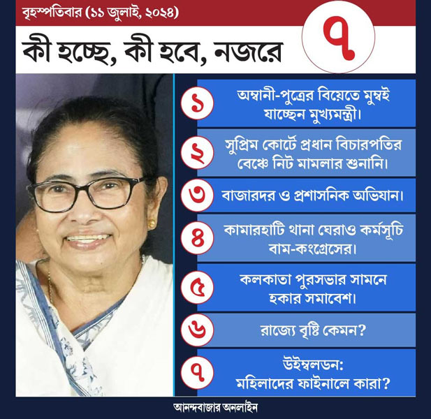 মুকেশ অম্বানীর পুত্র অনন্ত অম্বানীর বিয়ের অনুষ্ঠানে যোগ দিতে মুম্বই যাবেন মুখ্যমন্ত্রী মমতা বন্দ্যোপাধ্যায়। আজ বিশেষ বিমানে মুম্বই রওনা হওয়ার কথা তাঁর। শুক্রবার বিয়ের অনুষ্ঠানে যোগ দেবেন মমতা। তার আগে আজ মুম্বই পৌঁছে উদ্ধব ঠাকরের সঙ্গে বৈঠক করতে পারেন বাংলার মুখ্যমন্ত্রী। শুক্রবার বিয়ের অনুষ্ঠানে যোগ দেওয়ার আগে তিনি এনসিপি নেতা শরদ পওয়ারের সঙ্গেও বৈঠক হতে পারে তাঁর। নবান্ন সূত্রে এমনটাই জানা গিয়েছে।