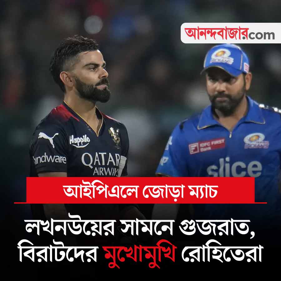 আইপিএলে আজও জোড়া ম্যাচ। প্রথম ম্যাচে মুখোমুখি লখনউ সুপার জায়ান্টস ও গুজরাত টাইটান্স। প্রথম ম্যাচে হারার পর দু’টি ম্যাচ জিতেছে লখনউ। এর মধ্যে শেষ ম্যাচে কলকাতা নাইট রাইডার্সের বিরুদ্ধে হারা ম্যাচে তাদের জিতিয়েছেন মুকুল চৌধুরি। আজ জয়ের হ্যাটট্রিক করার লক্ষ্যে নামবে তারা। অন্য দিকে শুভমন গিলের গুজরাত প্রথম ম্যাচে হারার পর শেষ দু’টি ম্যাচ জিতেছে। তার মধ্যে দিল্লি ক্যাপিটালসের বিরুদ্ধে ১ রানে জয় রয়েছে। আজ কী হবে? খেলা শুরু বিকেল ৩:৩০ থেকে। দ্বিতীয় ম্যাচে লড়াই রোহিত শর্মা ও বিরাট কোহলির। মুম্বই ইন্ডিয়ান্স খেলবে রয়্যাল চ্যালেঞ্জার্স বেঙ্গালুরুর সঙ্গে। দুই দলেরই এটি চতুর্থ ম্যাচ। বেঙ্গালুরু দু’টি জিতেছে, একটি হেরেছে। মুম্বই একটি জিতেছে, দু’টি হেরেছে। এই ম্যাচ সন্ধ্যা ৭:৩০ থেকে। খেলা দেখা যাবে স্টার স্পোর্টস চ্যানেল ও জিয়োহটস্টার অ্যাপে।