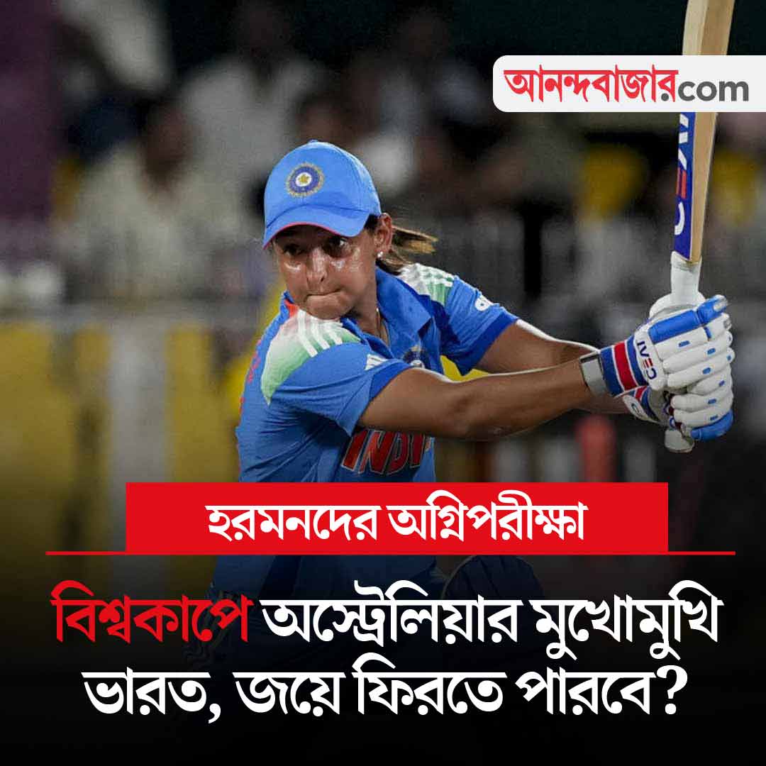 বিশ্বকাপে আজ ভারতের কঠিন পরীক্ষা। হরমনপ্রীত কৌরেরা মুখোমুখি বিশ্বচ্যাম্পিয়ন অস্ট্রেলিয়ার। জঘন্য বল করে আগের ম্যাচে দক্ষিণ আফ্রিকার কাছে হেরেছে ভারত। আজ হারলেই চাপ বাড়বে হরমনদের। খেলা বিকেল ৩টে থেকে। খেলা দেখা যাবে স্টার স্পোর্টস চ্যানেল ও জিয়োহটস্টার অ্যাপে।