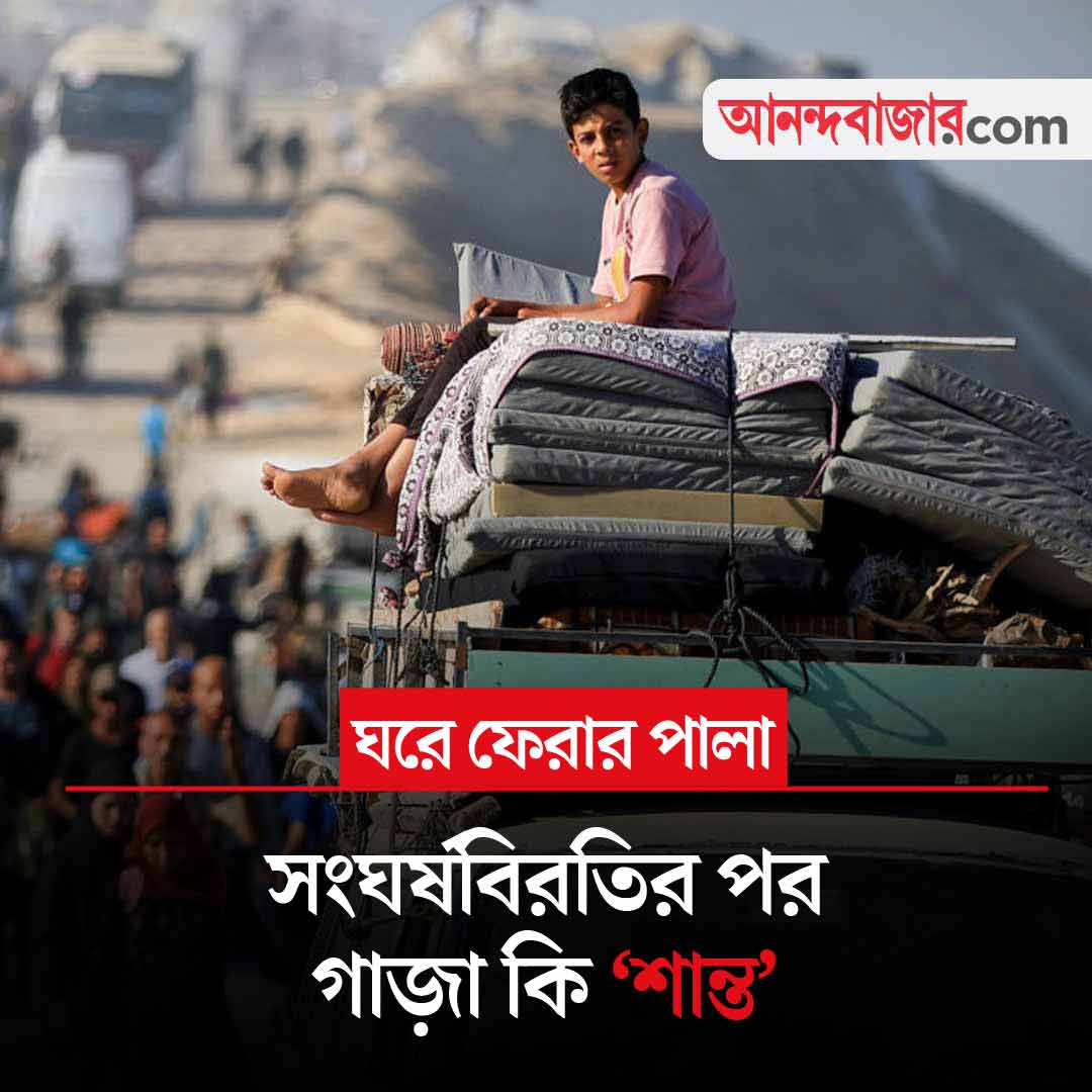 তিন দিন লাগাতার আলোচনা পর সংঘর্ষবিরতিতে রাজি হয়েছে ইজ়রায়েল এবং প্যালেস্টাইনপন্থী সশস্ত্র সংগঠন হামাস। মার্কিন প্রেসিডেন্ট ডোনাল্ড ট্রাম্পের শান্তিপ্রস্তাব মেনে প্রথম দফার সংঘর্ষবিরতি কার্যকর হয়েছে গাজ়ায়। শুক্রবার থেকেই প্যালেস্টাইনিরা আবার গাজ়ায় নিজের বাড়ি ফিরছেন। আপাতত গাজ়ায় কোনও গোলাগুলির শব্দ নেই। গাজ়াবাসী আশাবাদী, ফিরবে আগের পরিস্থিতি। একই সঙ্গে চুক্তি মেনে চলছে পণবন্দি বিনিময়েও। আজ এই সংক্রান্ত খবরের দিকে নজর থাকবে।