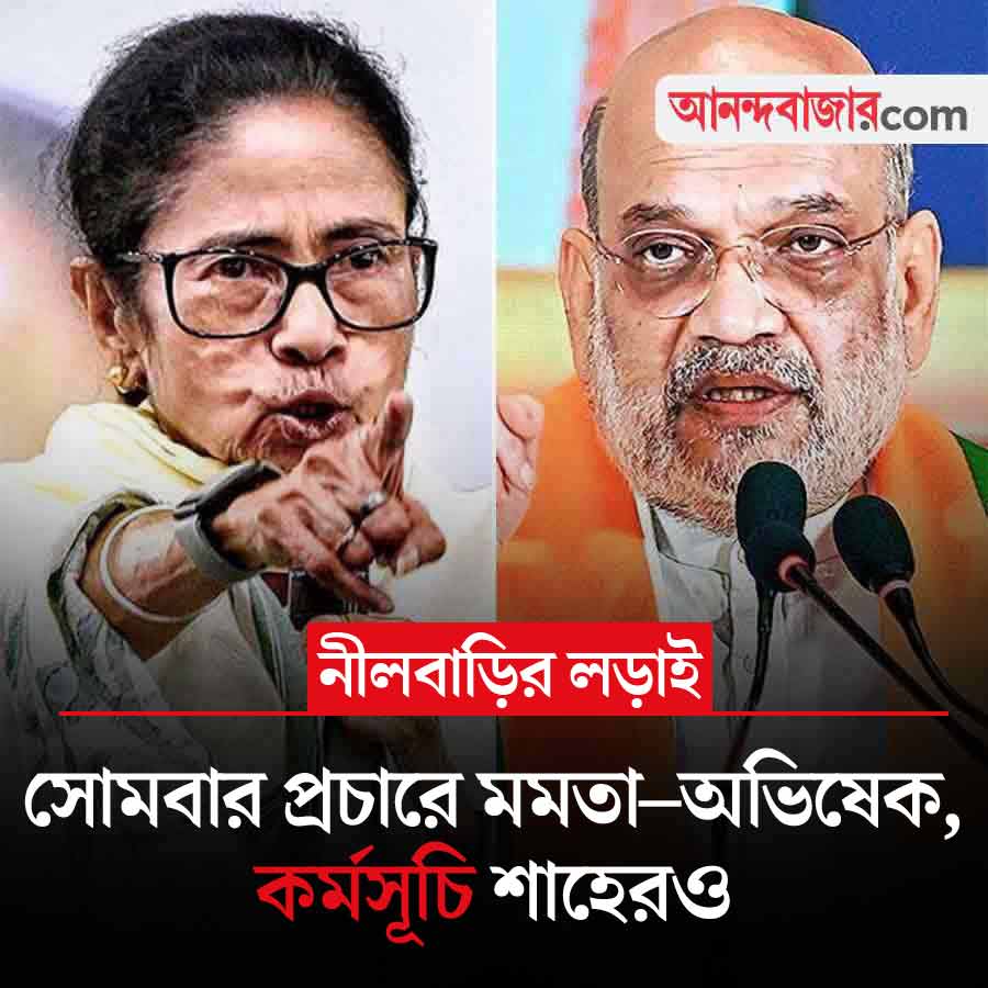 সোমবার নির্বাচনী প্রচারে জমজমাট হতে চলেছে রাজ্য রাজনীতি। মুখ্যমন্ত্রী মমতা বন্দ্যোপাধ্যায় তিনটি জনসভা করবেন— সিউড়ি, আউশগ্রাম এবং দুর্গাপুর পূর্ব বিধানসভা কেন্দ্রে। অন্য দিকে, কেন্দ্রীয় স্বরাষ্ট্রমন্ত্রী অমিত শাহ বীরভূম জেলার বোলপুর ও খয়রাশোলে সভা করবেন। পাশাপাশি পশ্চিম বর্ধমানে একটি জনসভা ও রোড শোতেও যোগ দেবেন তিনি। তৃণমূল কংগ্রেসের সর্বভারতীয় সাধারণ সম্পাদক অভিষেক বন্দ্যোপাধ্যায় করিমপুর, রানাঘাট ও বাদুড়িয়ায় তিনটি জনসভা করবেন।