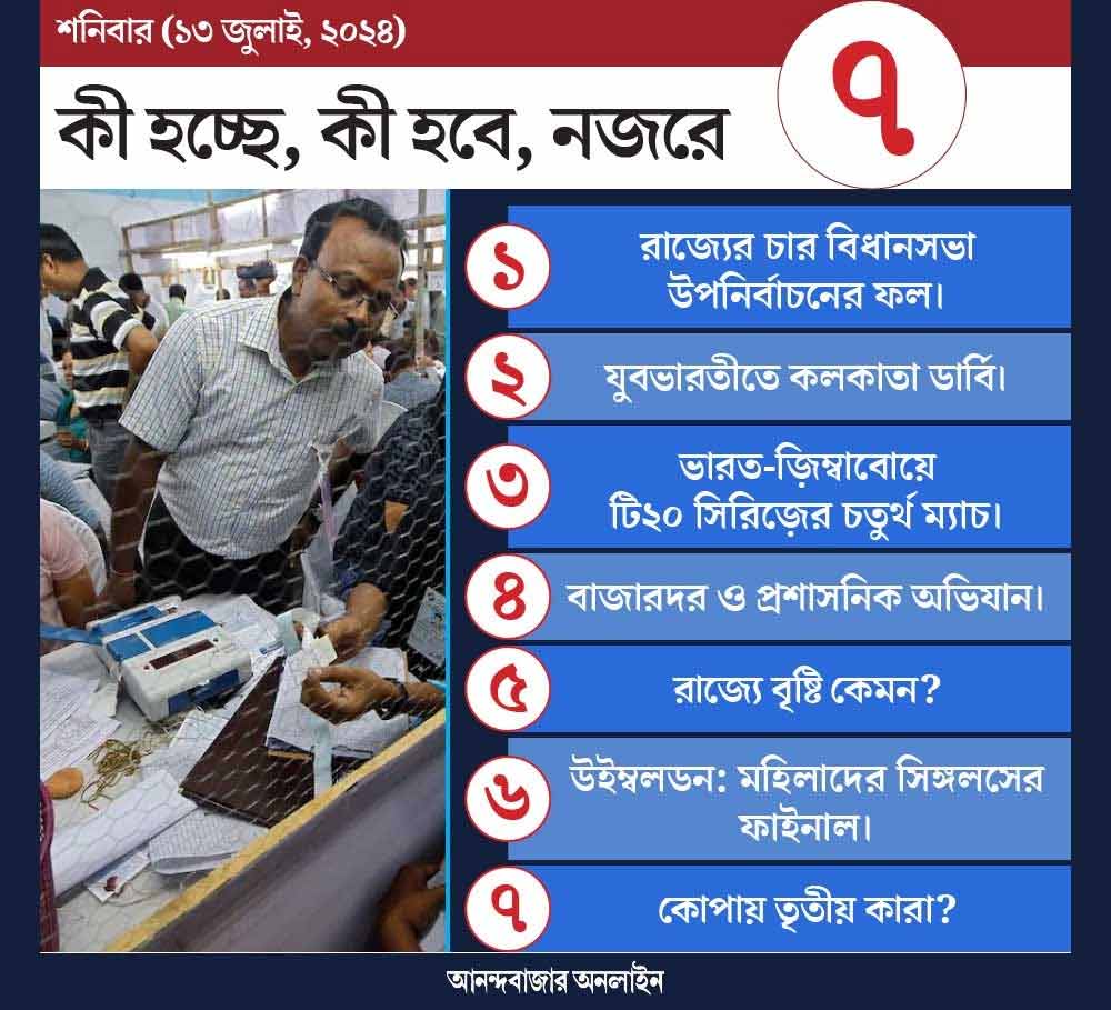 আজ বাংলার চার বিধানসভা কেন্দ্রের ফল ঘোষণা হবে। বুধবারের ভোটে বিক্ষিপ্ত কিছু অশান্তির ঘটনা বাদ দিলে মোটের উপর শান্তিপূর্ণ ভাবেই শেষ হয়েছে ভোটপর্ব। সবচেয়ে বেশি ভোট পড়ে রায়গঞ্জে। সেখানে ভোটের হার ৭১.৯৯ শতাংশ। এ ছাড়া, নদিয়ার রানাঘাট দক্ষিণে ভোট পড়ে ৭০.৫৬ শতাংশ, উত্তর ২৪ পরগনার বাগদায় ভোট পড়ে ৬৮.৪৪ শতাংশ। সবচেয়ে কম ভোট পড়েছিল কলকাতার মানিকতলায়। সেখানে ভোটদানের হার ৫৪.৯৮ শতাংশ। উল্লেখ্য, ২০২১ সালের বিধানসভা নির্বাচনে ৭৭টি আসনে জয় পেয়েছিল বিজেপি। সেই ভোটে দুই সাংসদ নিশীথ প্রামাণিক এবং জগন্নাথ সরকারকে প্রার্থী করেছিল পদ্মশিবির। বিধানসভা ভোটে জিতলেও তাঁরা সাংসদ পদ ছাড়েননি। ফলে ওই দুই আসনে উপনির্বাচন হয়। সেই ভোটে জেতে তৃণমূল। পরে বিজেপির সাত বিধায়ক দফায় দফায় দলত্যাগ করেন। এক বিধায়কের মৃত্যু হয়। ফলে বিধানসভায় বিজেপির আসন সংখ্যা একটা সময় ৬৭-তে নেমে যায়। তবে কালিয়াগঞ্জের বিধায়ক সৌমেন রায় তৃণমূলে গিয়েও ফিরে আসেন বিজেপিতে। বর্তমানে বিধানসভায় ৬৮টি আসন রয়েছে পদ্মশিবিরের। বুধবার উপনির্বাচন হওয়া চার কেন্দ্রের মধ্যে জেতা তিন আসন ধরে রাখতে পারে কি না বিজেপি, সে দিকে আজ নজর থাকবে। মানিকতলার ফল কী হয় তা নিয়েও থাকবে কৌতূহল।