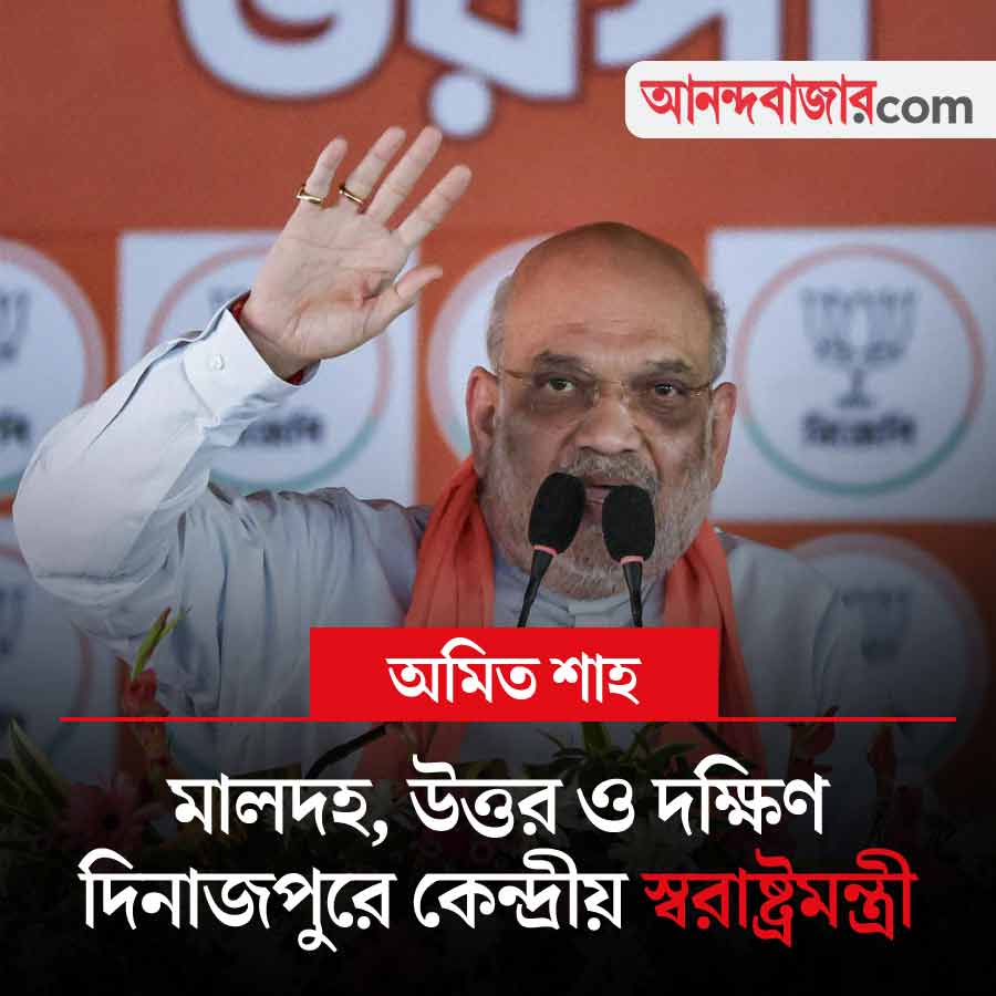 ভোটের প্রচারে আজ ঠাসা কর্মসূচি রয়েছে কেন্দ্রীয় স্বরাষ্ট্রমন্ত্রী অমিত শাহের। জেলায় জেলায় ঘুরে জনসভা এবং রোড শো করবেন তিনি। আজ তাঁর তিনটি জনসভা রয়েছে— দক্ষিণ দিনাজপুরের গঙ্গারামপুর, মালদহের মানিকচক এবং গাজোলে। তার আগে উত্তর দিনাজপুরে একটি রোড শো-ও করবেন তিনি। এই সংক্রান্ত খবরে নজর থাকবে আজ।
