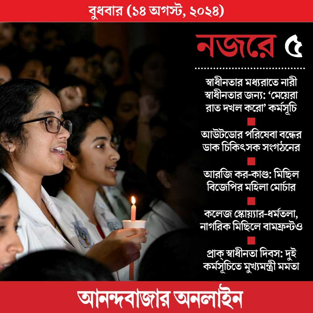 আরজি কর-কাণ্ডের প্রতিবাদে জমায়েত। তবে স্বাধীনতা দিবসের আগের রাতের সেই কর্মসূচির নামেও জুড়ে গিয়েছে ‘স্বাধীনতা’ শব্দটি। প্রথমে যে কর্মসূচির কথা সমাজমাধ্যমে ছড়িয়ে পড়ে তাতে লেখা ছিল, ‘স্বাধীনতার জন্য: মেয়েরা রাত দখল করো কর্মসূচি’। প্রথম দিকে এমনটা মনে করা হয়েছিল যে, মধ্যরাতে কলকাতার রাজপথ ভরাবেন মেয়ারা। ঘোষণা ছিল, যাদবপুর, কলেজ স্ট্রিট এবং অ্যাকাডেমি অফ ফাইন আর্টস প্রাঙ্গনে হবে জমায়েত। এর পরে তার কলেবর বৃদ্ধির কথাও সমাজমাধ্যম সূত্রে জানা যায়। কলকাতার বিভিন্ন জায়গার পাশাপাশি জেলাগুলিতেও জমায়েত হবে বলে প্রচার চলেছে।