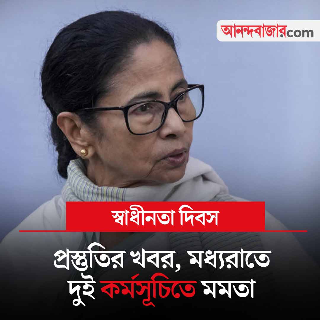 স্বাধীনতা দিবস উপলক্ষে প্রতি বছর সন্ধ্যায় মুখ্যমন্ত্রী মমতা বন্দ্যোপাধ্যায় বেশ কয়েকটি দলীয় কর্মসূচিতে যোগ দেন। এ বার দু’টি কর্মসূচিতে যোগ দেওয়ার কথা তাঁর। প্রথমে তিনি যাবেন বেহালায়। বেহালা ম্যান্টনে তৃণমূলের তরফে স্বাধীনতা দিবসের একটি কর্মসূচি আয়োজিত হয়। সেখানেই যোগ দিয়ে বক্তৃতা করবেন তিনি। এর পর তাঁর গন্তব্য হাজরা মোড়। সেখানেও স্বাধীনতা দিবসের কর্মসূচি রয়েছে।