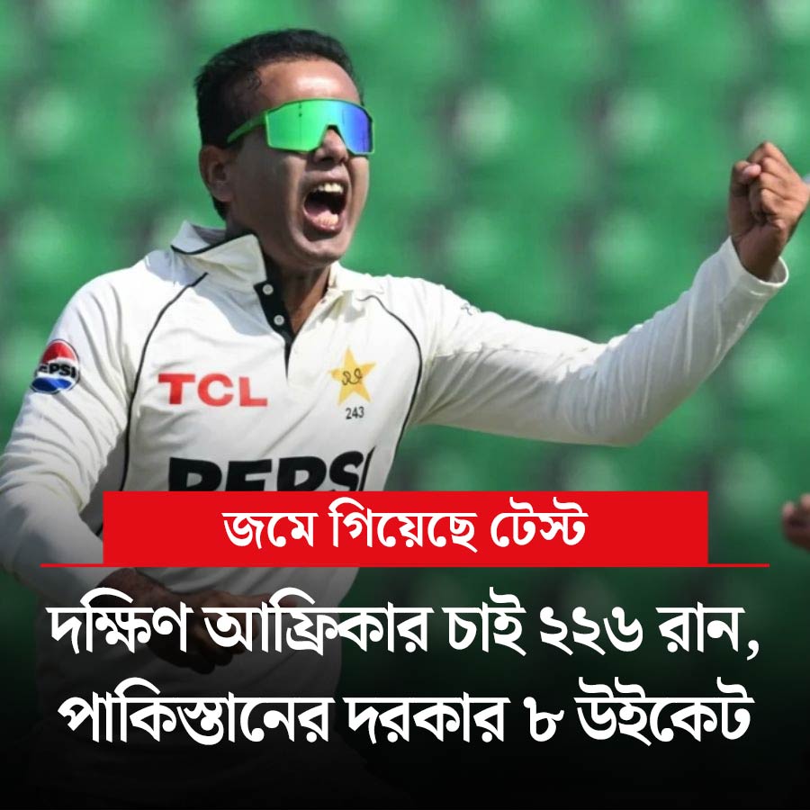 জমে গিয়েছে পাকিস্তান ও দক্ষিণ আফ্রিকার প্রথম টেস্ট। দক্ষিণ আফ্রিকার জেতার জন্য দরকার আর ২২৬ রান, হাতে ৮ উইকেট। প্রথম ইনিংসে পাকিস্তানের ৩৭৮ রানের জবাবে দক্ষিণ আফ্রিকার প্রথম ইনিংস শেষ হয় ২৬৯ রানে। দ্বিতীয় ইনিংসে পাকিস্তান ১৬৭ রানের বেশি করতে পারেনি। আজ চতুর্থ দিনের খেলা শুরু সকাল ১০:৩০ থেকে।