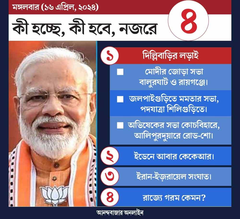 দিল্লিবাড়ির লড়াইয়ে আজ উত্তরবঙ্গে আবার ভোটপ্রচারে আসছেন প্রধানমন্ত্রী নরেন্দ্র মোদী। একই দিনে উত্তরবঙ্গে জনসভা রয়েছে মুখ্যমন্ত্রী মমতা বন্দ্যোপাধ্যায়ের। তৃণমূলনেত্রীর পাশাপাশি আজ উত্তরবঙ্গেই ভোটপ্রচার করবেন দলের সর্বভারতীয় সাধারণ সম্পাদক অভিষেক বন্দ্যোপাধ্যায়। আজ মোদীর জোড়া সভা রয়েছে। দুপুর আড়াইটের সময় তিনি প্রথম সভাটি করবেন বালুরঘাটে। পরে সওয়া ৪টায় তাঁর সভা রয়েছে রায়গঞ্জে। মমতা সভা করবেন জলপাইগুড়িতে। পরে তিনি শিলিগুড়িতে পদযাত্রা করবেন। অন্য দিকে, অভিষেক প্রথমে জনসভা করবেন কোচবিহারে। পরে তাঁর রোড-শো রয়েছে আলিপুরদুয়ারে।