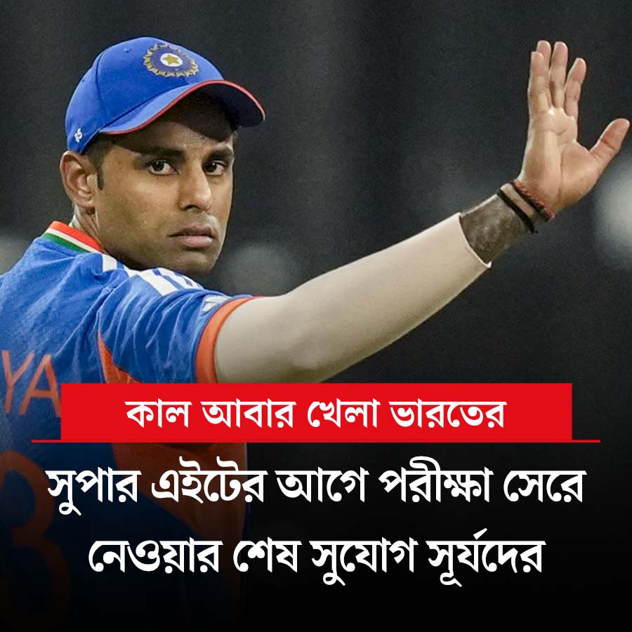 টি-টোয়েন্টি বিশ্বকাপের সুপার এইটে পৌঁছে গিয়েছে ভারতীয় দল। কাল গ্রুপের শেষ ম্যাচ নেদারল্যান্ডসের বিরুদ্ধে। সূর্যকুমার যাদবের দলের কাছে এই ম্যাচ নিয়মরক্ষার। সুপার এইটের কঠিন লড়াইয়ে নামার আগে পরীক্ষা-নিরীক্ষা সেরে নেওয়ার পালা কোচ গৌতম গম্ভীরের। আরও এক বার সুযোগ পেতে পারেন অর্শদীপ সিংহ। থাকছে ভারতীয় দলের সব খবর।