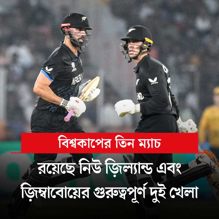টি-টোয়েন্টি বিশ্বকাপে আজ তিনটি ম্যাচ। তার মধ্যে দু’টি ম্যাচ অত্যন্ত গুরুত্বপূর্ণ। নিউ জ়িল্যান্ড মুখোমুখি কানাডার। এই ম্যচের উপর নিউ জ়িল্যান্ড এবং গ্রুপ ডি-র ভবিষ্যৎ অনেকটাই নির্ভর করছে। নিউ জ়িল্যান্ড হারলে কোণঠাসা হয়ে পড়বে। আগের ম্যাচে দক্ষিণ আফ্রিকার কাছে হেরেছিল তারা। এই ম্যাচ সকাল ১১টা থেকে। গ্রুপ বি-র ম্যাচে লড়াই জ়িম্বাবোয়ে এবং আয়ারল্যান্ডের। গত ম্যাচে অস্ট্রেলিয়াকে হারানো জ়িম্বাবোয়ে আজ জিতে গেলে সুপার এইটের দিকে অনেকটাই এগিয়ে যাবে। এই ম্যাচ বিকেল ৩টে থেকে। সন্ধ্যা ৭টা থেকে রয়েছে স্কটল্যান্ড-নেপাল ম্যাচ। সব খেলা দেখা যাবে স্টার স্পোর্টস চ্যানেল ও জিয়োহটস্টার অ্যাপে।